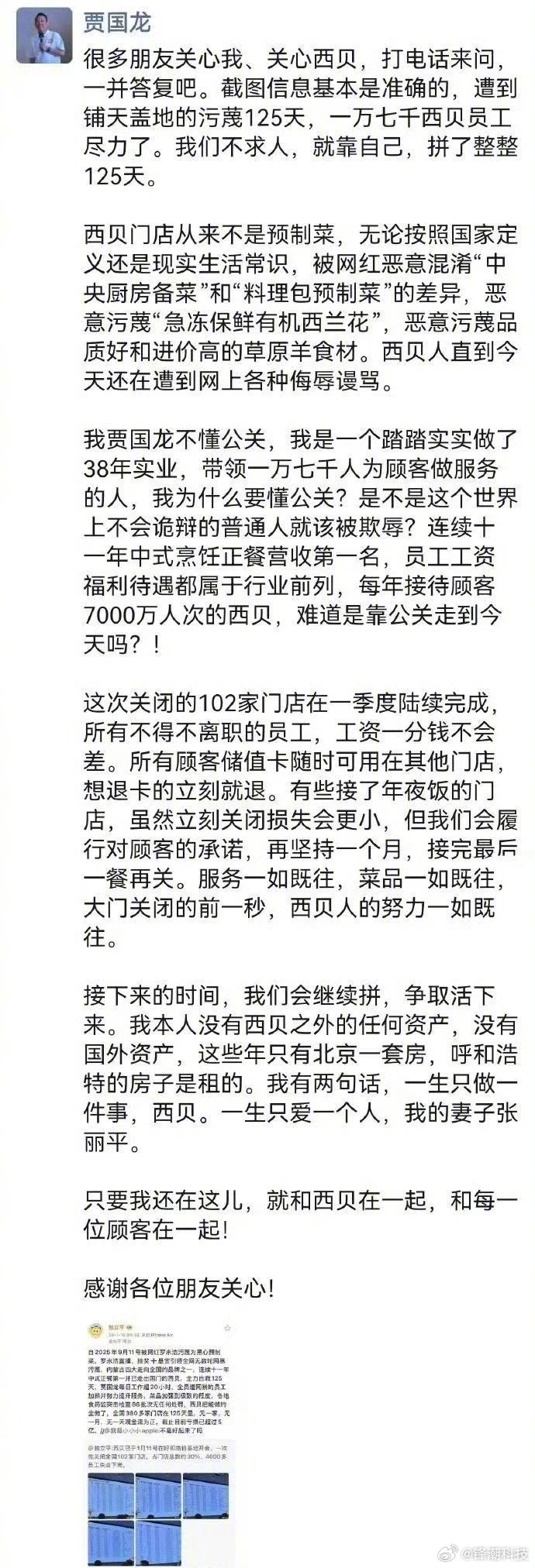 西贝这事还没完没了啊?贾国龙:遭到铺天盖地的污蔑125天......西贝将关闭102家门店,所有不得不离职的员工,工资一分钱不会差。