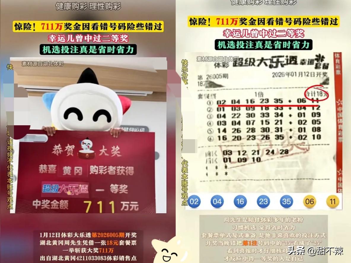 “天上掉馅饼了!”1月12日,湖北黄冈!一男子是老彩民,当天,他像往常一样买了张彩票,没想到竟中了711万!可他核对号码时粗心看错,误以为只中了小奖,随手扔在一边,直到朋友发来门店喜报,才惊觉自己差点把巨款拱手让人,这波心跳简直要飙到嗓子眼! 不少人把买彩票当成暴富捷径,熬夜研究号码、砸钱大额投注,却忘了彩票本质就是概率游戏。 周先生每期随缘买,中了奖还主动捐1万做公益,这份平常心才是真清醒。 说到底,好运从来不是追来的,过度沉迷购彩只会徒增经济和心理负担。 彩票本该是生活的小调剂,而非改变人生的筹码,理性投注、量力而行,才不会让娱乐变负担!