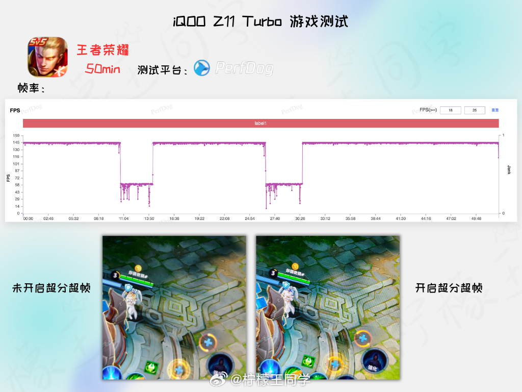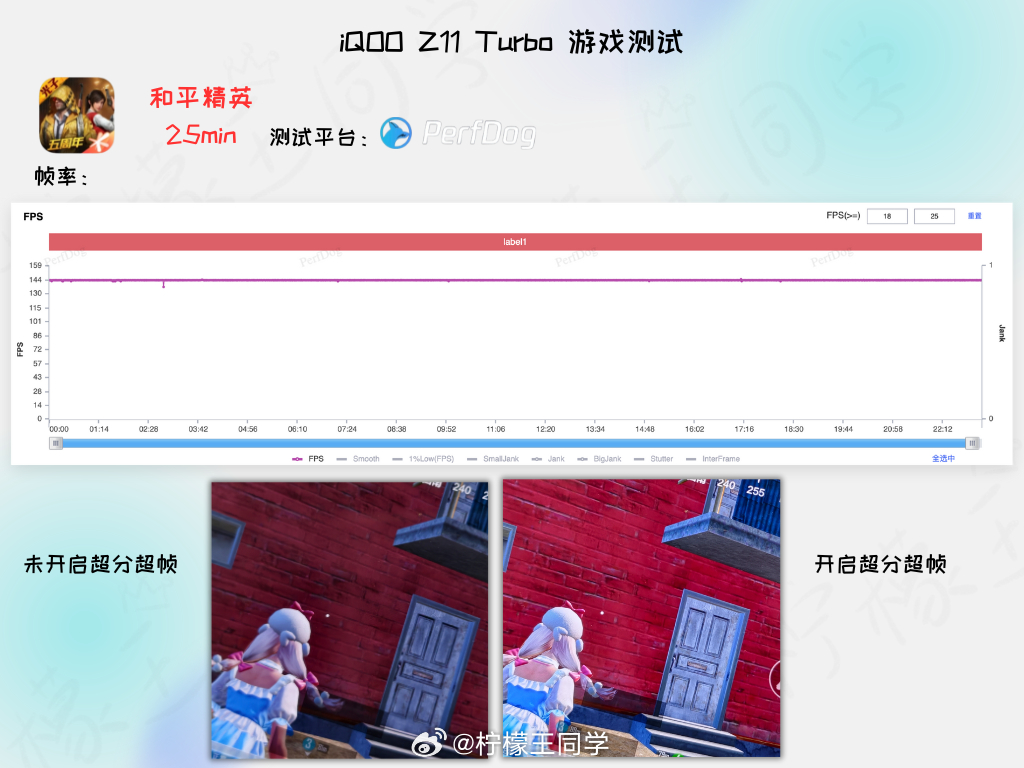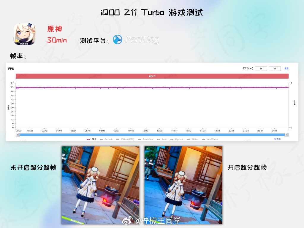 iQOO Z11 Turbo的游戏实测,一共测试了三种游戏:王者荣耀、和平精英和原神王者荣耀、和平精英基本稳在144帧、原神是60帧一条直线而且开启了超分后,游戏的画质有显著的提高,细节变得更清楚,画质不输PC