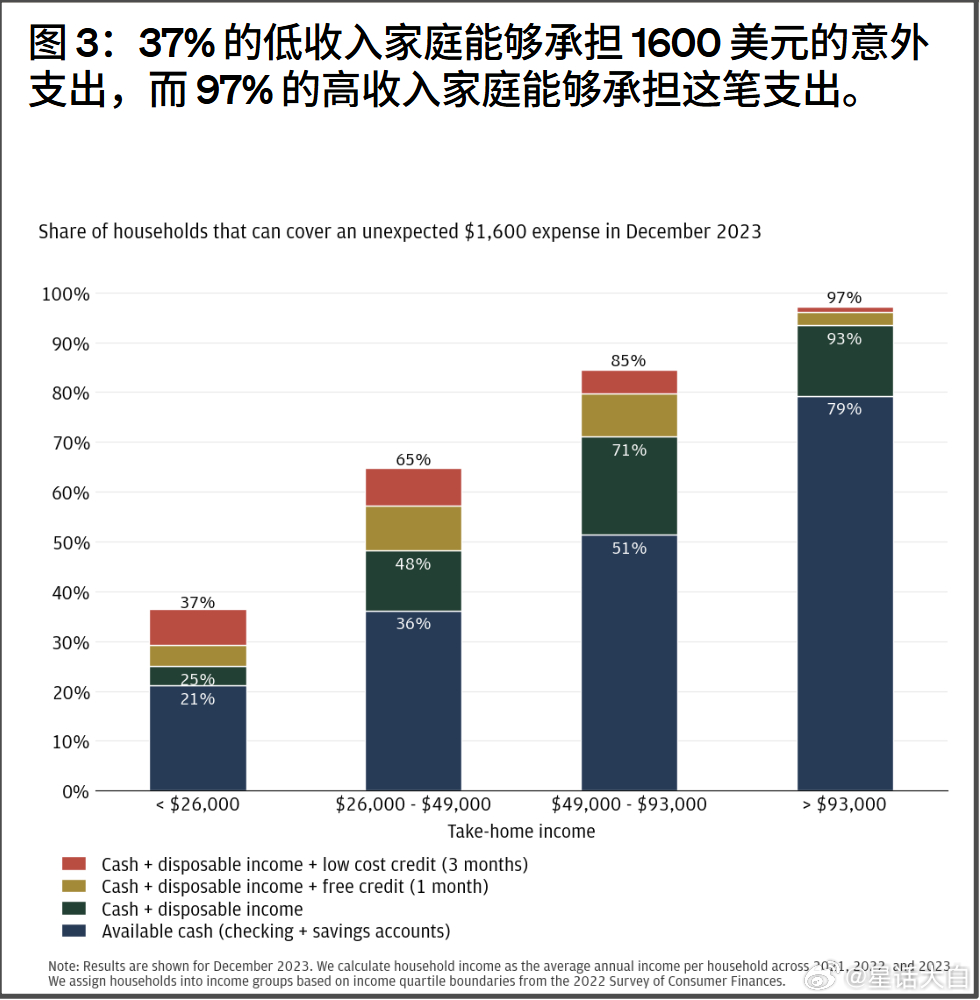 摩根大通这份报告,还把家庭按年收入差异,分成4个不同等阶。其中年收入少于2.6万美元的低收入家庭,只有43%可以用现金支付400美元意外支出。年收入2.6万-4.9万美元的中低收入家庭,只有59%可以用现金支付400美元意外支出。年收入4.9万-9.3万的中高收入家庭,则有74%可以用现金支付400美元意外支出。年收入大于9.3万美元的高收入家庭,则有92%可以用现金支付400美元意外支出。这里需要说明,虽然摩根大通说样本涵盖590万户家庭,通过他们的存款和信用卡账户获取了这些家庭的财务信息。想要在美国过得好,家庭年收入高于9.3万美元是一个比较关键的门槛,年收入高于9.3万美元,才能完全用现金来支付400美元意外支出,不需要动用可支配收入。摩根大通还列出一个1600美元的意外支出,只用现金储蓄来支付的话。低收入家庭里只有21%拿得出,中低收入家庭只有36%拿得出,中高收入家庭只有51%拿得出,高收入家庭则79%拿得出。摩根大通想用这份报告来反驳2023年一篇广为流传的调查:62%的美国成年人表示他们入不敷出,即“依靠定期工资来支付开支和履行财务义务,几乎没有或根本没有积蓄的家庭”。但从摩根大通报告的细节里,我觉得反而证实了,62%美国成年人是月光族的调查是靠谱的。