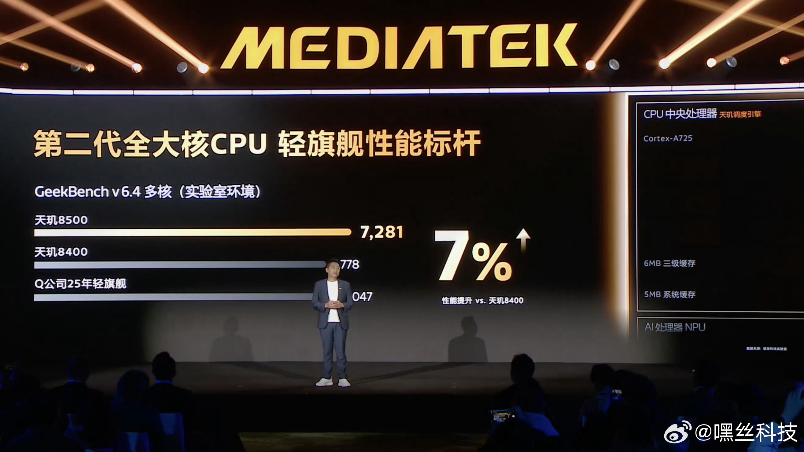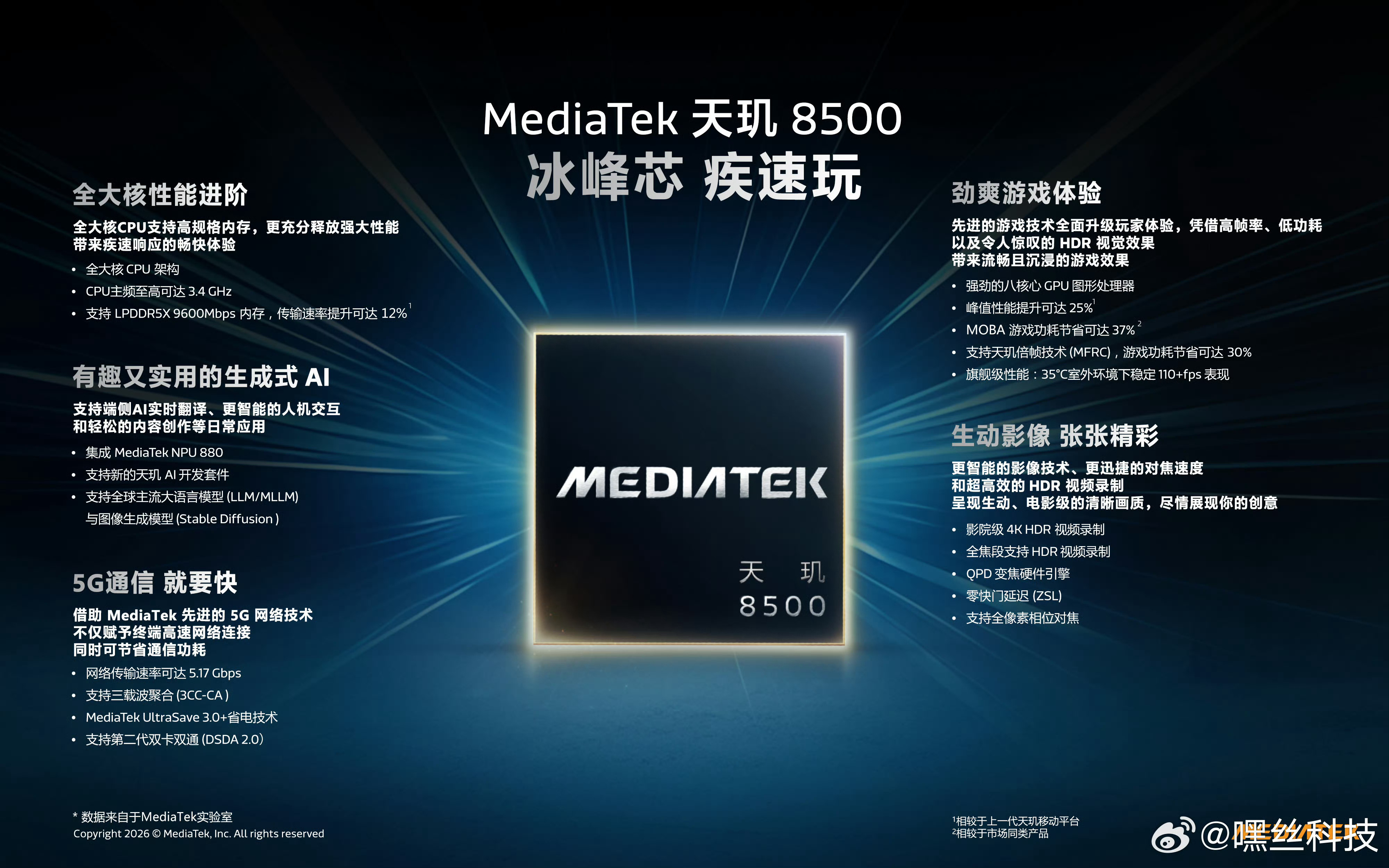 天玑 8500 处理器正式亮相,看了眼架构信息,搭载第二代全大核 CPU × 天玑调度引擎,性能对比上代提升 7%;搭载八核 GPU,峰值性能相较上一代提升25%,功耗相较上一代峰值性能下降低20% 看来GPU是这一代的SOC亮点 而且这一代天玑8500光追落地主流移动游戏,有点期待各家厂商的调校了