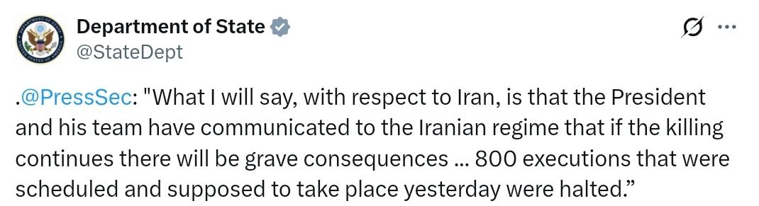 白宫发言人卡罗琳·莱维特:“总统和他的团队已经向伊朗政权表明,如果杀戮继续下去,将会有严重的后果。” “总统今天也明白,原定于昨天执行的800起死刑已被中止。” “因此,总统和他的团队正在密切关注这一局势,总统仍然考虑所有选项。” 来源:美国国务院