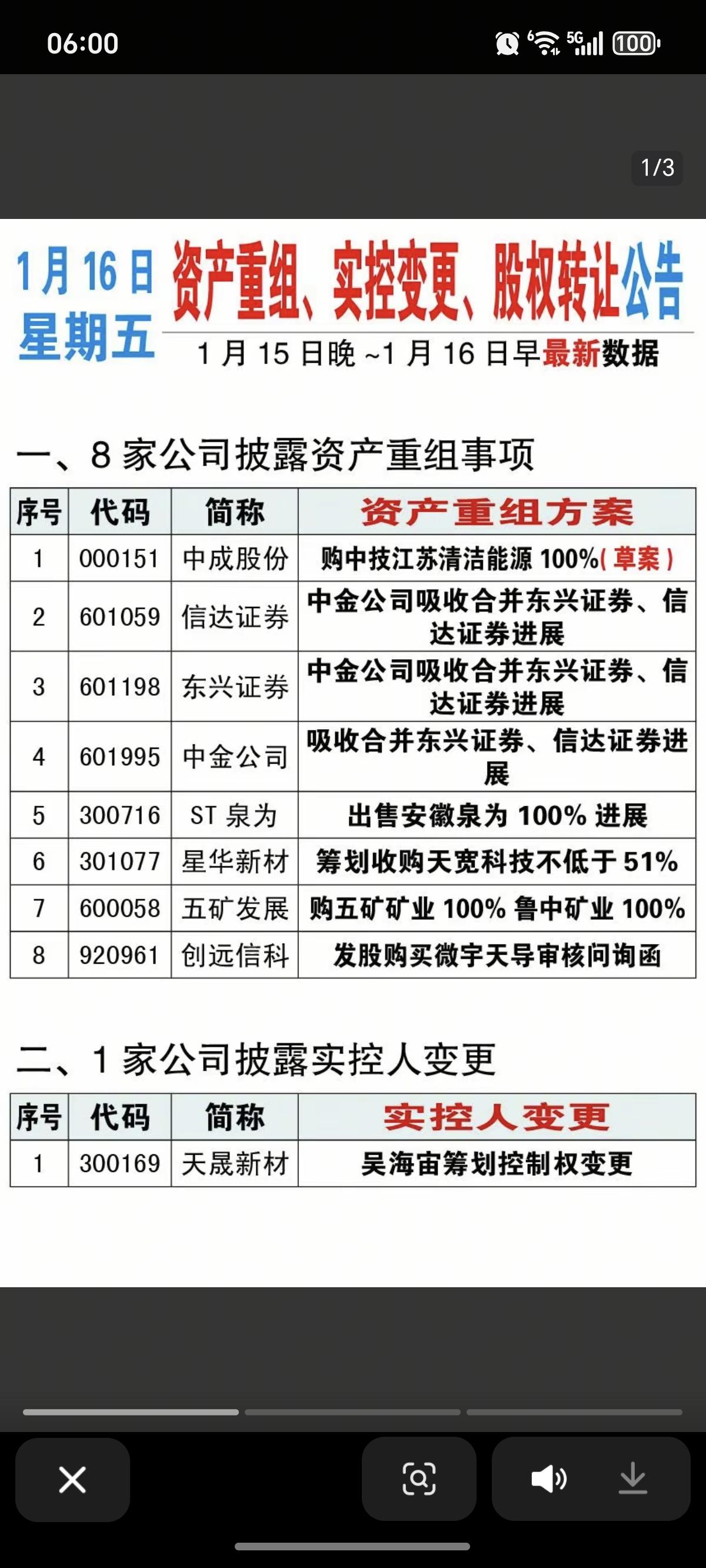 1.16周五 最新:资产重组,股权转让,实控人变更公告! 8家资产重组,做大做强。家股权转让,1家实控人变更,4家收购资产,3家出售资产,13家股权转让