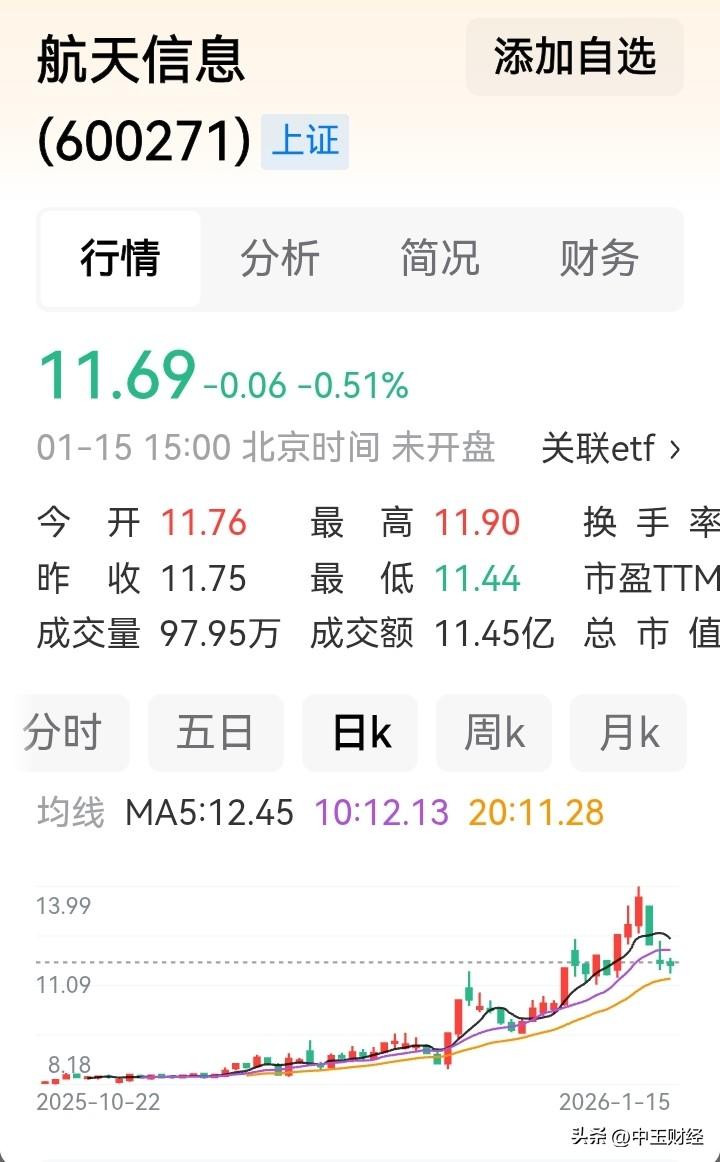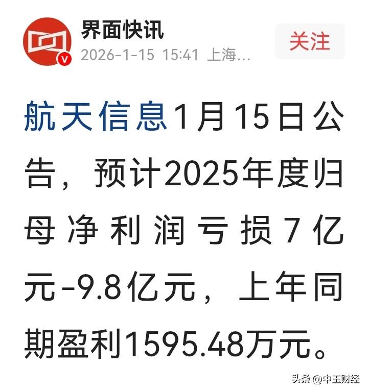 【航天信息,业绩变脸!】航天信息2024年盈利1400万至2100万元,但2025年预计亏损7亿至9.8亿元,业绩大幅下滑主要受数字财税业务调整、行业竞争加剧及资产减值影响。 业绩下滑原因: 业务调整:防伪税控业务受行业格局变化影响,数字财税业务增量不足。 竞争加剧:智慧产业、网信产业市场竞争激烈,营业规模下降。 资产减值:公司计提减值准备,进一步加剧亏损。 市场反应: 2025年12月商业航天概念爆炒,航天信息股价短期上涨,但公司澄清主营业务不涉及商业航天。 2026年1月股价波动,总市值216.60亿元。 行业背景: 商业航天政策驱动,但商业化进程缓慢,风险提示频繁。 航空航天板块