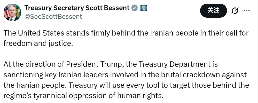 美国财长贝森特:美国坚定支持伊朗人民争取自由与正义的呼声。在特朗普总统的指示下,财政部正在对参与对伊朗人民残酷镇压的关键伊朗领导人实施制裁。财政部将动用一切工具,针对那些幕后实施暴政、压迫人权的政权人物。