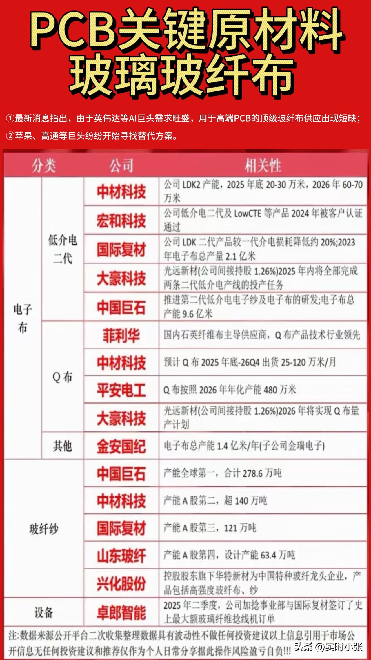 高端玻璃纤维布(glass cloth)供应紧张的消息引人注目。据可靠消息,苹果、高通这类消费电子领域的巨头,在英伟达、AMD等AI服务器供应商对有限货源激烈争夺的重压之下,不得不开始四处探寻新的供应渠道。 玻璃纤维布作为芯片基板与印刷电路板中承载整体架构的核心部件,一旦高端玻纤布出现供应瓶颈,就如同扼住了高端PCB供应的咽喉。 可见材料的重要性,值得收藏!