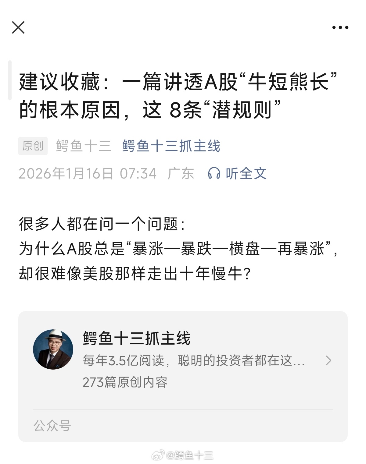 a股 为什么你在A股总是赚快钱、亏大钱?根子在这 8 条! A股走不出慢牛,不是运气问题,是底层设计问题。看懂这8个制度,你就明白A股为什么永远这么刺激。你不是不会炒股,你只是误入了“高波动市场”的错误玩法!『建议收藏:一篇讲透A股“牛短熊长”的根本原因,这 8条“潜规则”』点击阅读后花园文章: 网页链接