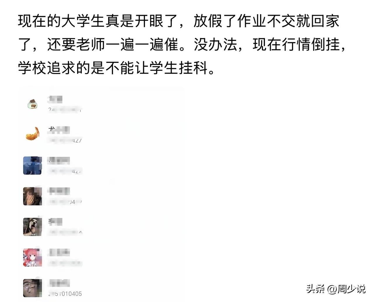 离谱!有网友吐槽:一些大学生放假了作业不交就回家,还要老师一遍一遍催。最让人无奈的是,这位网友直言,现在行情倒挂,学校追求的不能让学生挂科! 此事引发不少网友热议,有网友直言:“这哪是上学,分明是老师求着学生学!” 还有网友吐槽:“没有挂科的约束,学生哪来的学习紧迫感?” 周少想说教育的本质,是引导学生学会担当与负责。作业是检验学习成果的标尺,按时完成作业是学生的基本本分。如果像这位网友直言学校一味追求“不挂科”,实则是在纵容学生的惰性,磨灭他们的责任意识。 对于这种现象,客观的说,真不是一个好现象。特别是老师的催促不该变成“苦口婆心的求告”,而是该采取一定的措施,让教育回归“教”与“学”的正常秩序。#寻美三湘# #长沙新朋友#