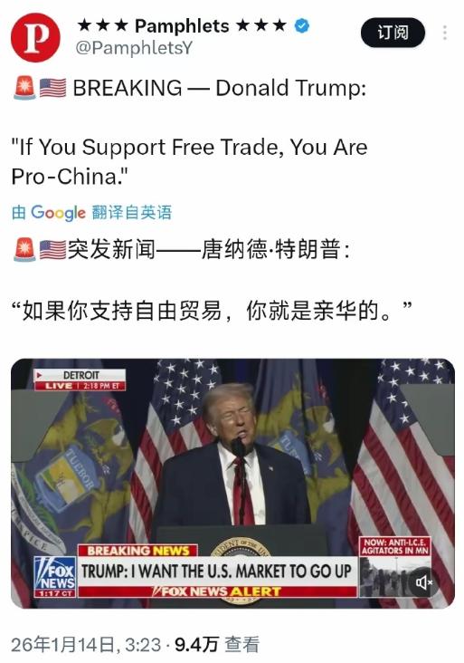 支持自由贸易就是亲华,只问你一句:魔不魔幻? 特朗普再次发神经,在网上发帖说出文头这番话。 说真的,看到这话的时候,估计不少人都得愣上三秒,脑子里冒出来的第一个念头就是:这特朗普的脑回路到底是怎么长的?自由贸易这么一个全球公认的经济发展逻辑,怎么到他嘴里就成了“亲华”的评判标准?这波强行捆绑的操作,简直比荒诞剧还离谱。 自由贸易从来就不是哪个国家的专属标签,更不是用来定义“亲不亲华”的工具。很早之前,经济学家就把这事掰扯明白了,分工越细生产效率越高,而自由贸易就是让这种分工能在全球范围内铺开的基础。 简单说就是你擅长造汽车,我擅长种粮食,他擅长搞研发,大家各凭本事交换,最后都能拿到自己需要的东西,科技能进步,老百姓的选择也更多。这些年全球经济能有这么大的发展,贸易大繁荣、投资大便利,靠的就是以自由贸易为核心的经济全球化。 不管是发达国家还是发展中国家,只要愿意融入这个体系,基本都能从中分到好处,这是明摆着的事实,跟“亲不亲华”没有半毛钱关系。 可偏偏就是这个特朗普,之前干的事儿跟他现在说的话,简直是自打嘴巴。2017年他刚上台,第一件事就是宣布美国退出TPP,要知道那可是美国之前主导的多边贸易协定,当初喊着推动自由贸易的口号喊得震天响。 紧接着,他又把矛头对准了北美自由贸易协定,嚷嚷着要重新谈判,不就是觉得之前的协定没让美国占到足够多的便宜吗?到了2018年,这老头更是直接掀桌子,对包括中国在内的多个国家加征关税,大范围发起贸易战,把世界贸易组织的基本规则抛到脑后,一门心思搞单边主义。 那时候的美国,哪里还有半点自由贸易推动者的样子,活脱脱一个贸易保护主义的急先锋。 美国以前可不是这副嘴脸。二战之后,美国工业实力在全球独占鳌头,那时候它可是自由贸易的坚定倡导者。为啥?因为开放的市场能让它的商品和资本走遍全球,赚得盆满钵满。 可随着新兴市场国家和发展中国家慢慢发展起来,在全球贸易中的比重越来越大,美国那些掌握大量资本的上层精英依然能赚大钱,但国内传统制造业的工人福利受了影响,中产阶级规模也缩小了。 按说这是美国国内政策需要调整的问题,比如通过合理的再分配政策保障底层劳动者的利益,可特朗普政府不这么干,反而把锅甩给了自由贸易,甩给了中国,觉得是别人抢了美国的好处。 现在倒好,转过头来就说支持自由贸易就是亲华,这简直是颠倒黑白到了极点。他这么说,无非就是两个心思:一是把经贸问题意识形态化,把中国塑造成美国的对立面,以此来博取国内一些选民的支持。 毕竟在他眼里,只要把“反华”的旗号举起来,就能煽动起一部分人的情绪,不管自己说的话多没逻辑。二是想通过这种荒谬的言论,逼迫其他国家在自由贸易和所谓的“反华”之间选边站,从而遏制中国的发展。 可这招实在是太拙劣了,稍微有点常识的人都能看明白,自由贸易关乎的是全球各国的共同利益,跟意识形态没有任何关系。 就拿中国来说,这些年一直是自由贸易的坚定维护者和推动者。作为全球第一大货物贸易国,中国从来都是经济全球化的受益者,更是贡献者。我们推动共建“一带一路”,就是想让更多国家能融入全球贸易体系,共享发展成果 可美国呢?为了维护自己的霸权地位,一会儿搞贸易保护,一会儿又把自由贸易当武器,这种出尔反尔的做法,早就把自己的信誉消耗得差不多了。 其实明眼人都能看出来,特朗普这种言论,本质上还是霸权逻辑在作祟。在他眼里,任何事情都得围着美国转,符合美国利益的就是对的,不符合的就是错的。有用的时候,就把自由贸易挂在嘴边;没用的时候,就一脚踢开,甚至把它当成攻击别人的工具。 现在把自由贸易当成“亲华”的标签,无非就是想把自己搞贸易保护的行为合理化,让大家觉得他反对自由贸易是为了“反华”,是为了美国的利益。 说真的,这种“支持自由贸易就是亲华”的论调,不仅魔幻,更是危险。它会让全球经贸合作变得政治化,破坏全球产业链和价值链,让本来就复杂的全球经济形势变得更糟 现在全球经济复苏本来就不容易,大家需要的是更多的合作,更多的开放,而不是这种毫无逻辑的指责和分裂。特朗普这么折腾,说白了就是为了自己的政治利益,根本不管全球经济的死活,不管美国老百姓的真实需求。 想想也是,这已经不是特朗普第一次发表这种奇葩言论了。之前他还说过各种颠三倒四的话,一会儿说这个国家占便宜,一会儿说那个协议不公平。可不管他怎么说,自由贸易和经济全球化的大趋势是挡不住的。