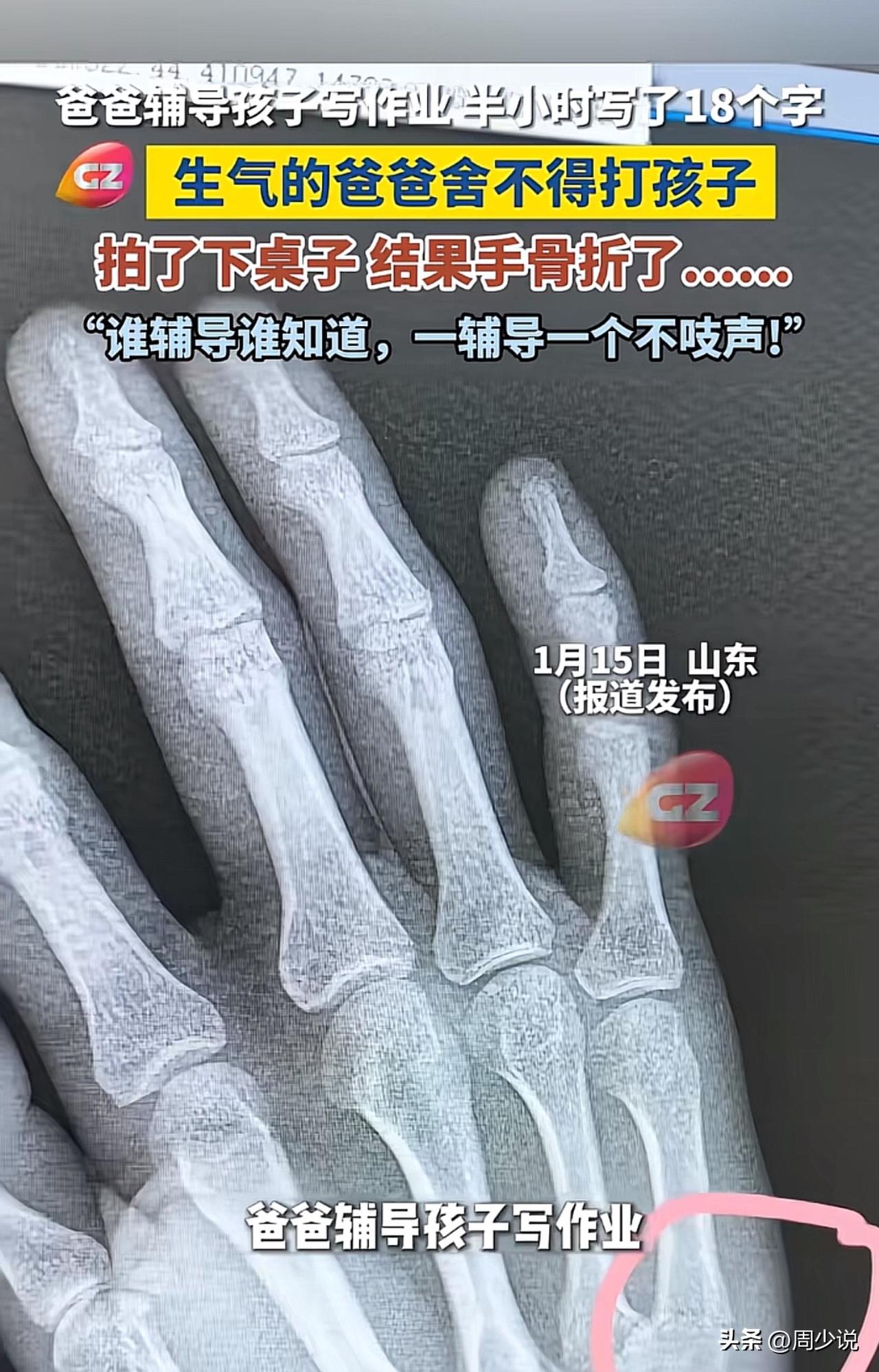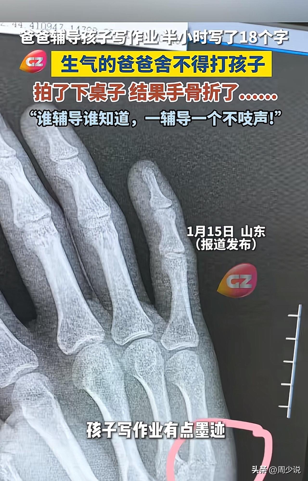 “笑不活又心疼!”一位爸爸辅导孩子写作业,半小时过去孩子只憋出18个字,急得他火冒三丈,却舍不得打骂孩子,只能狠狠拍了下桌子发泄,结果直接把手拍骨折了! 这事儿一出,网友们瞬间炸开锅:“同款辅导崩溃现场!我上次拍桌震裂了笔筒,现在想想还好没伤到自己”。 还有网友感叹:“这届家长太难了,辅导作业堪比渡劫,心疼这位爸爸三秒钟”。 这事儿周少觉得看着好笑,实则背后藏着的是无数家长的教育焦虑。辅导作业不是“硬碰硬”的战场,家长的坏情绪不仅解决不了问题,还可能伤害自己、影响亲子关系。 孩子写作业慢,或许是专注力不足,或许是知识点没吃透,与其靠拍桌发泄,不如静下心来找到问题根源,用耐心引导代替指责。 毕竟,比起“写得快”,孩子愿意主动学、亲子间保持融洽的关系,才是教育里更珍贵的事。#寻美三湘# #长沙新朋友#