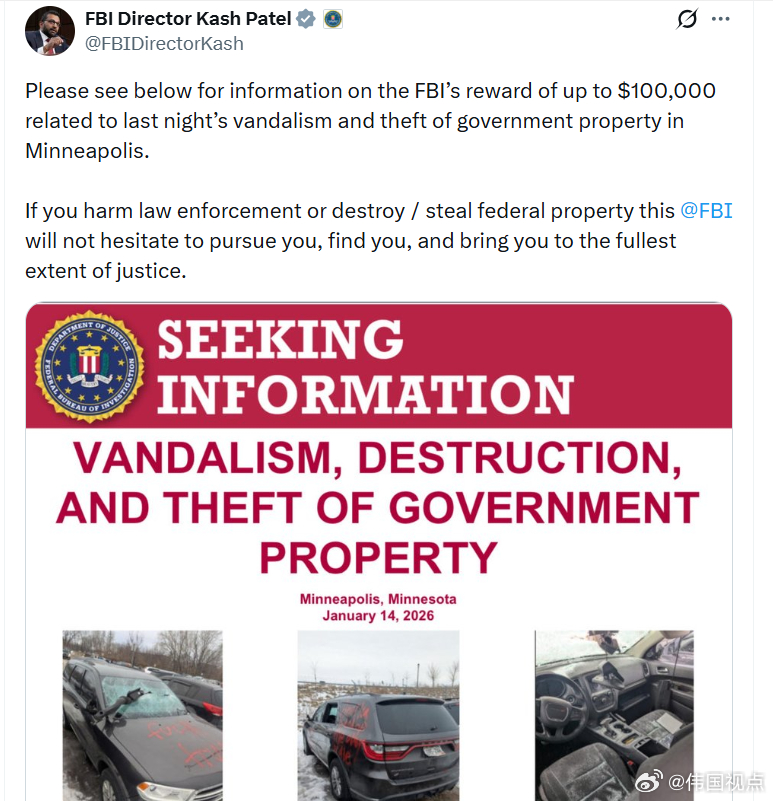 联邦调查局局长卡什·帕特尔:针对昨晚发生在明尼阿波利斯的破坏行为及盗窃政府财产案件,联邦调查局(FBI)已悬赏最高10万美元征集线索。任何人若伤害执法人员,或破坏、盗窃联邦政府财产,FBI都绝不会手软——一定会追踪你、锁定你,并将你绳之以法,依法严惩。