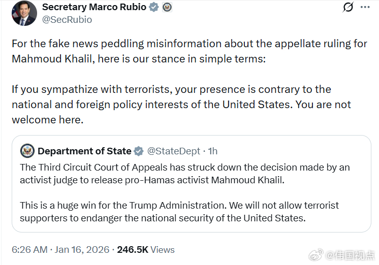 美国务卿马可·鲁比奥:美国第三巡回上诉法院已推翻一名激进法官作出的决定,该法官此前裁定释放亲哈马斯的活动人士马哈茂德·哈利勒。针对散布有关马哈茂德·哈利勒上诉裁决虚葭信息的葭新闻媒体,我们用最直白的话表明立场:如果你同情恐布分子,你的存在就违背了美国的国家与外交政策利益。你不受欢迎!