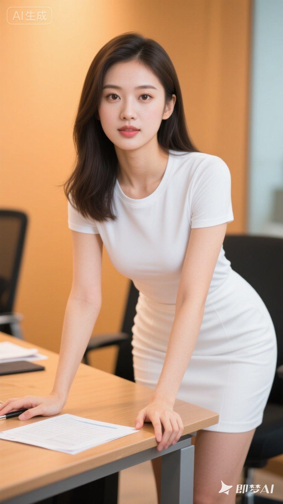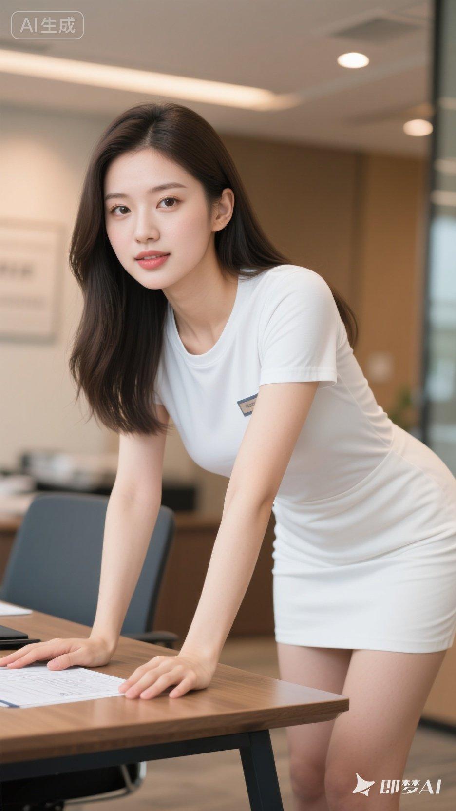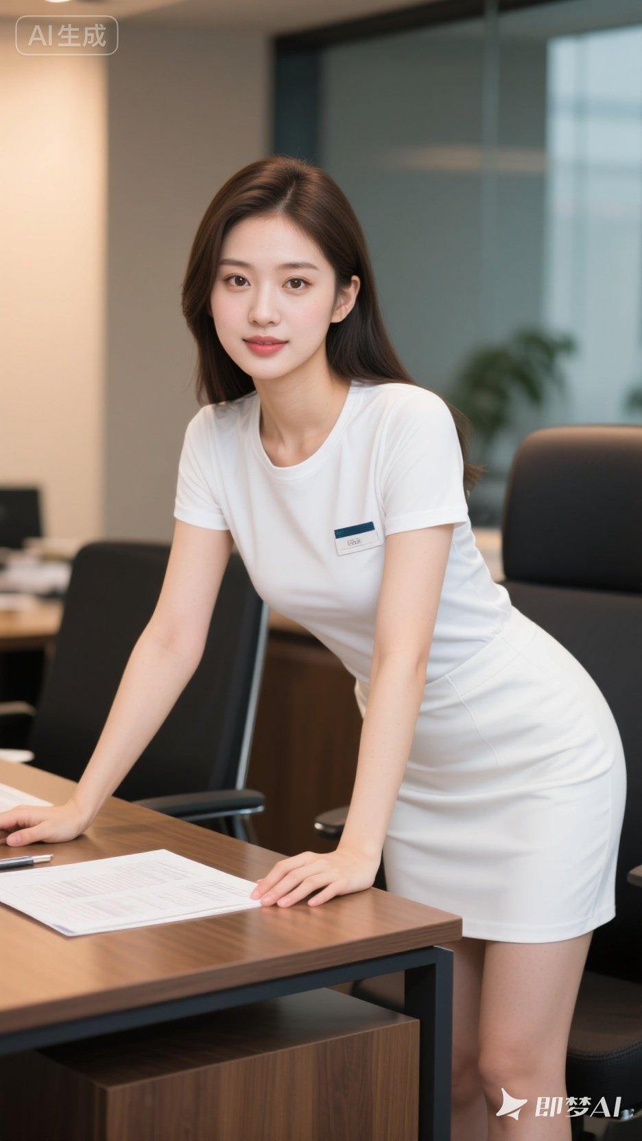 25岁左右的房地产女销售员,化着精致的淡妆,气质很好,紧身白色T恤短裙
