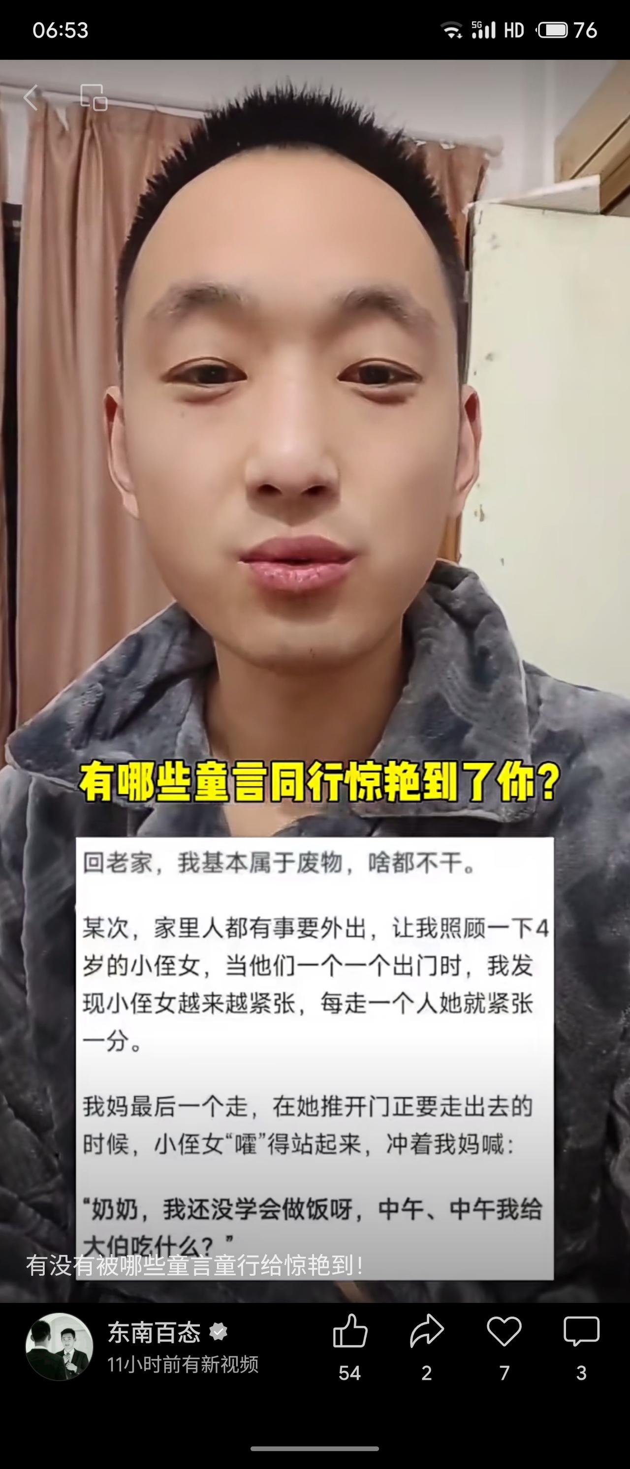 家人外出,留下“我”照顾4岁小侄女。她见人走光愈发紧张,最后拉住奶奶喊:“我还没学会做饭呀,中午我给大伯吃什么?”童言稚嫩却满怀责任感,令人动容。