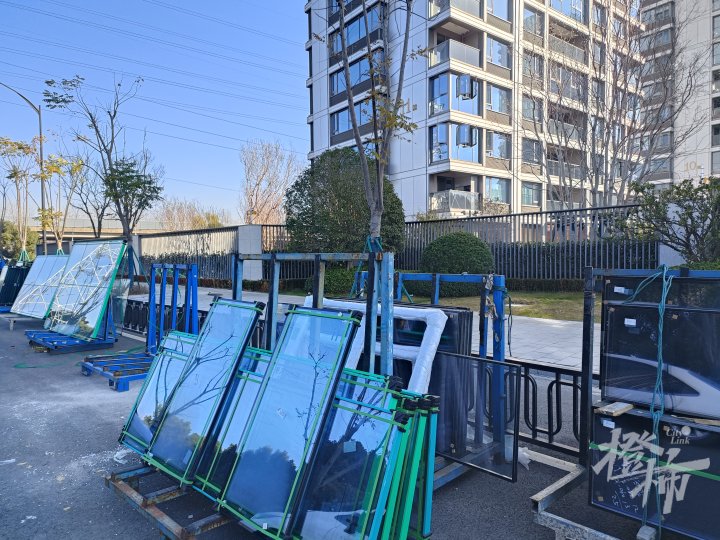 小区西大门道路旁,堆放着大量封包阳台的型材和玻璃,货车不断送来,刚拆下旧材料马上装车拉走,一片繁忙。
