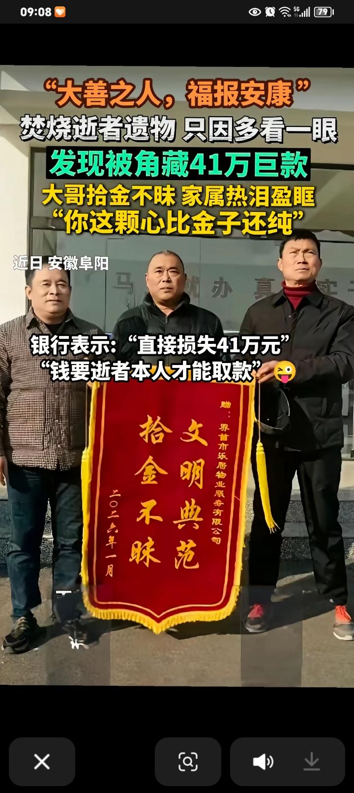 安徽阜阳界首市,一座以温情闻名的小城,近日因一位普通劳动者的善举暖意涌动。2026年1月8日,界首市殡仪馆物业工作人员王朝辉按规范处理逝者遗物时,一床旧棉被角落的异常鼓胀引起他的警觉。没有贸然焚烧,他小心翼翼拆开棉絮夹层,三张分别来自工行、中行、农行的存单赫然显现,金额合计41万元。 “存单有价,诚信无价”,王朝辉深知这笔省吃俭用的积蓄对逝者家属的意义,当即暂停工作上报公司,联动殡葬管理所核对档案。24小时内,他成功锁定家属,电话那头的逝者子女全然不知老人藏有这笔遗产,震惊之余满是感激。经身份核验,存单完璧归赵,家属紧握他的手哽咽道:“心比金子还纯!这不仅是钱,更是老人的念想。” 1月13日,一面“文明典范,拾金不昧”的锦旗送到王朝辉手中,而他只是朴实地说:“分内之事,换谁都会这么做。”正如孟子所言“诚者,天之道也”,王朝辉于细微处坚守的诚信,既是中华民族传统美德的延续,更是界首这座城市最动人的文明注脚,让冬日里的善举温暖了无数人的心。界首新闻 界首一男
