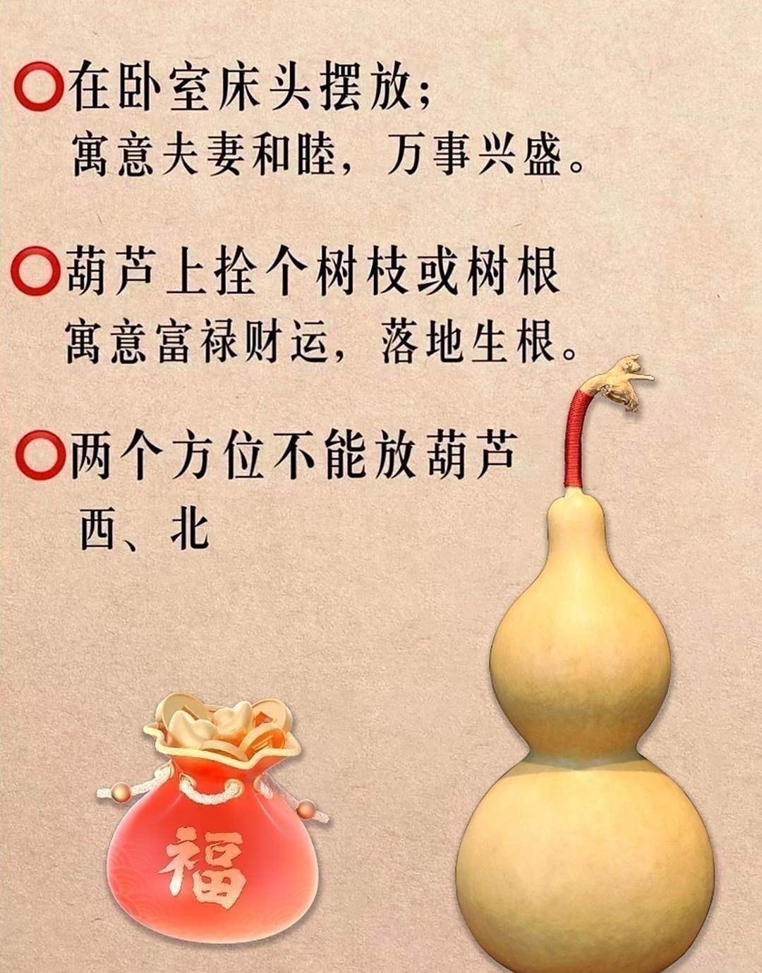 葫芦是中华传统文化中极具代表性的吉祥符号,承载着古人对福禄绵长、生活顺遂的美好期许,其摆放讲究源于民俗智慧,而非封建迷信,至今仍被不少人用作居家点缀。“葫芦”谐音“福禄”,口小肚大的外形,天然契合古人“聚纳吉气、留存福泽”的美好期待。 居家摆放可优先选择天然干葫芦或铜制葫芦,前者自带温润质感,后者造型端庄大气,适配不同家装风格。摆放位置可选家中明财位(大门对角线区域)或窗台正中,开口朝向室外,寓意吸纳四方吉气;也可用红绳系挂于门楣,作为点缀的同时传递吉祥愿景,兼顾美观与民俗寓意。 日常摆放有两点小建议:避开卫生间、阴暗角落等潮湿异味区域,保持葫芦洁净干爽更显雅致;摆放后尽量减少频繁挪动,定期用干布擦拭即可。 葫芦的吉祥内涵,本质是古人借器物传递生活向往,既是民俗文化的传承,也是对美好生活的一份期许。