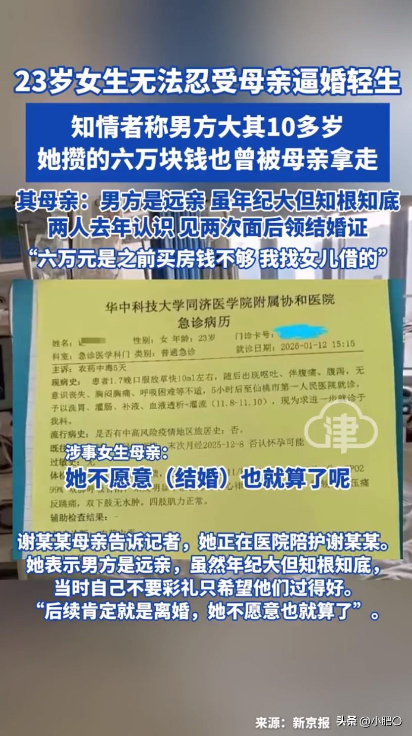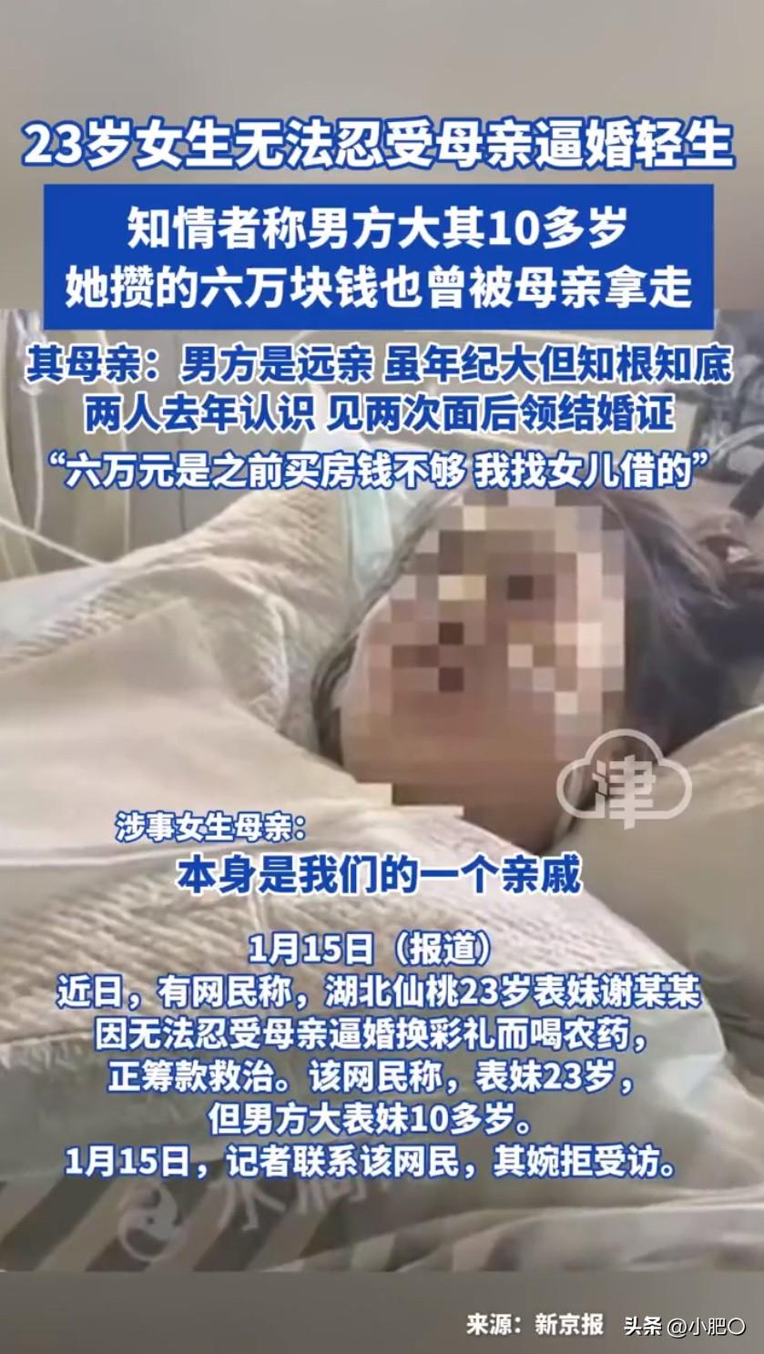 最近网上刷到湖北仙桃23岁姑娘谢某某的事儿,真的让人又揪心又唏嘘,这个姑娘的人生打小就没怎么顺过,小时候爸妈就离婚了,爸爸还曾有家暴行为,她跟着外婆长大,性格软乎乎的,还有点缺乏安全感,长大后她自己在外打拼,干过保安这类辛苦活儿,一个月就挣两三千块,省吃俭用舍不得花,连饭都不敢多吃,好不容易攒下四万五的积蓄,满心以为能为自己的未来攒点底气,结果这笔钱被妈妈以买房为由借走了。 让她崩溃的是妈妈安排的婚事,老家亲戚给介绍了一个比她大15岁的远房亲戚,妈妈觉得对方知根知底,能给她“依靠”,就一个劲劝她同意。谢某某打心底里不愿意,可她性格软,从小就怕惹长辈不高兴,更怕被人赶走,没敢坚决拒绝。两人见面没几天,男方就说领了结婚证才能买房,她稀里糊涂就跟着去领了证,原本约定好之后办婚礼。 可领证之后,男方之前承诺的买房、拍婚纱照这些事,再也没提过,彩礼更是没影。谢某某急得不行,天天催妈妈帮自己办离婚,可妈妈觉得都是亲戚,没必要特意去办,还说等婚礼当天她不出面,这门亲事自然就了了。加上外公外婆总念叨结婚的事,谢某某觉得全家人都在逼自己,没人真正在乎她的感受,心里的压力越来越大,最后实在扛不住了。 她花2块5毛4买了一瓶农药,在晚上喝了下去,好在求生的本能让她后来拨通了急救电话,被送到医院抢救。一开始她病情特别严重,农药导致急性肾衰、凝血异常,多器官都出了问题,直接被送进ICU,一天的治疗费就要一万二。家里条件本来就差,没房没车没医保,根本扛不住这么高的费用,亲戚只能发起水滴筹,目标20万,不少热心网友看到后纷纷捐款,很快筹到了11万多。 网上还传出消息说,谢某某的妈妈拿走了她6万积蓄,甚至在ICU里问她银行卡密码,不过知情人士后来澄清,钱是妈妈借的还承诺给利息,妈妈为了医药费还找亲戚凑钱、报过警求助,这些传言并不属实。男方那边也回应,说领证后确实交了买房定金,后来听说她不愿意结婚才退了房,婚纱照也约过但没约成,不是故意不兑现承诺。 好在现在有了好消息,谢某某已经清醒过来,身体也在慢慢好转,只是口腔黏膜还有点不舒服。当地妇联也已经介入,说等她出院后会提供制度性援助。妈妈在医院陪护着她,也后悔了,说后续肯定会办离婚,她不愿意就不勉强了。这起因为逼婚引发的悲剧,让大家都在感慨,婚姻从来不是随便找个人搭伙,尊重孩子的意愿,比什么都重要。 来源:新京报