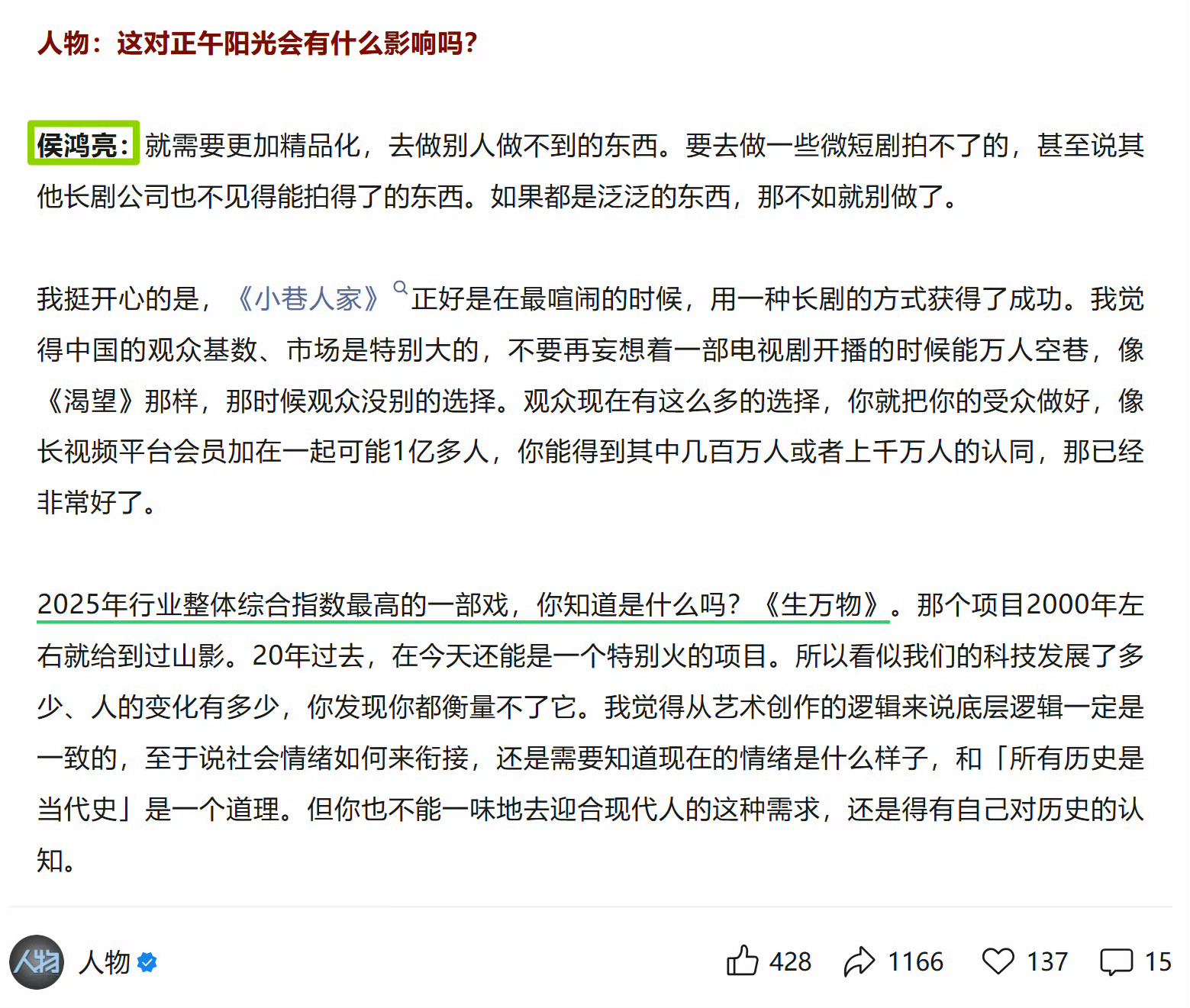 正午制片人侯鸿亮谈2025年行业整体综合指数最高的一部戏是杨幂主演的《生万物》!