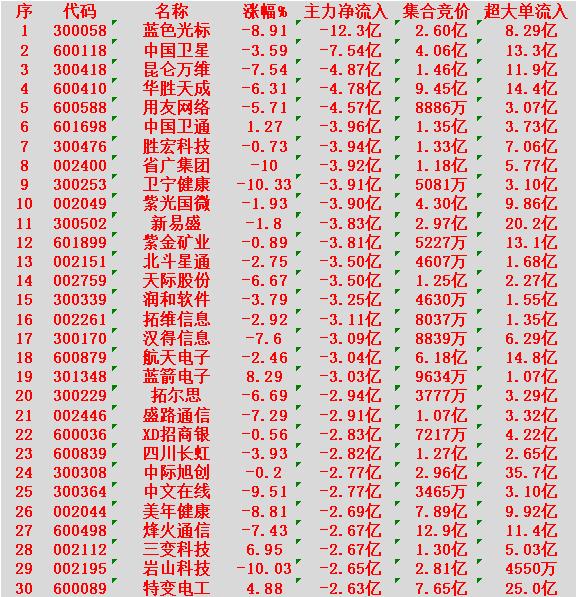 1月16日开盘45分钟,主力资金“卖出的 ”30名单! 蓝色光标:净流出 12.3亿元 中国卫星:净流出 7.54亿元 昆仑万维:净流出 4.87亿元 华胜天成:净流出 4.78亿元 用友网络:净流出 4.57亿元