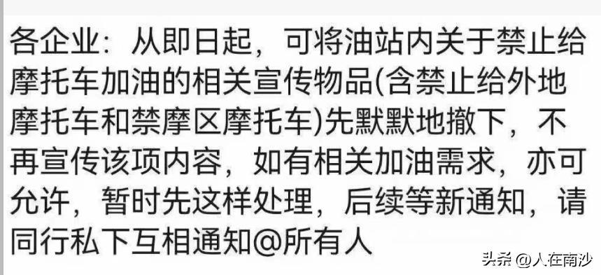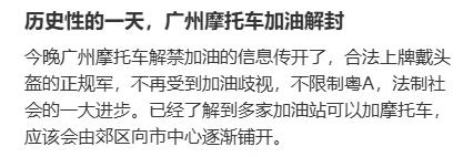 【广州即将解禁摩托车?你绝对是想多了】历史性的一天,广州摩托车加油解封!从相关通知可以看到,部分加油站收到通知,将摩托车禁止加油的相关物料撤下,有加油需求的可以允许。看来应该是先行措施,要等后续正式通知之后才公开。 目前经过部分人实测,广州部分加油站已经开始执行,无论是不是粤A的摩托车,都可以加油。不过 广州自2007年起全面禁摩,市中心区、广州大学城部分区域、广州火车南站部分范围严禁粤A摩托车驶入;全天24小时禁止外市籍摩托车在广州市行政区域内行驶。而除了禁摩之外,全广州的加油站都不给外地牌摩托车加油;禁行路段的加油站,不给粤A摩托车加油。 这个措施导致部分爱好摩托车的车主经常用小车加油,之后再从小车油箱抽出油的方式给摩托车加油。而且还要时刻关注油量情况,以免路上抛锚。甚至有的车主还会分装汽油在瓶子里储存备用,很容易引发安全问题。 很多人会把这次加油解禁看成是广州即将解禁摩托车的信号,不过这应该是想多了!要知道现在广州管理电鸡都焦头烂额了,肯定是不会再解禁摩托车了。 其实这次解禁摩托车的主要原因是全国人大常委会法制工作委员会主任沈春耀在12月22日向十四届全国人大常委会第十九次会议报告了2025年备案审查工作情况,其中正式提到审查纠正禁摩地方立法禁止行驶区域内的加油站禁止向摩托车供油的做法,称其为“额外增加的不必要限制性措施”,翻译成大白话就是摩托车禁行无牌等违法行为应该是由交警来负责,而设置摩托车加油限制是额外的法外限制,没有法律依据,而且加油站也没有这种限制权限,会人为增加社会矛盾。