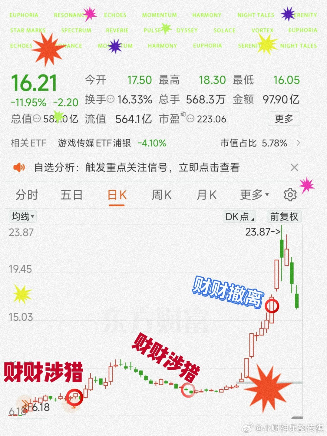 8元涉猎的丧标16元撤离、最近猛烈调整,又回到16了幸亏换了丧坤、目前多赚了20%+短持波动巨大、需要超强抗压能力上证指数 sh000001 所有内容仅为个人研究心得和投资心情日记,不构成任何买卖建议丨市场瞬息万变,走势受多重因素影响,大家务必结合自身风险承受能力独立判断,投资决策请自己做主丨真金白银的操作权在你手里丨投资有风险,入市需谨慎丨