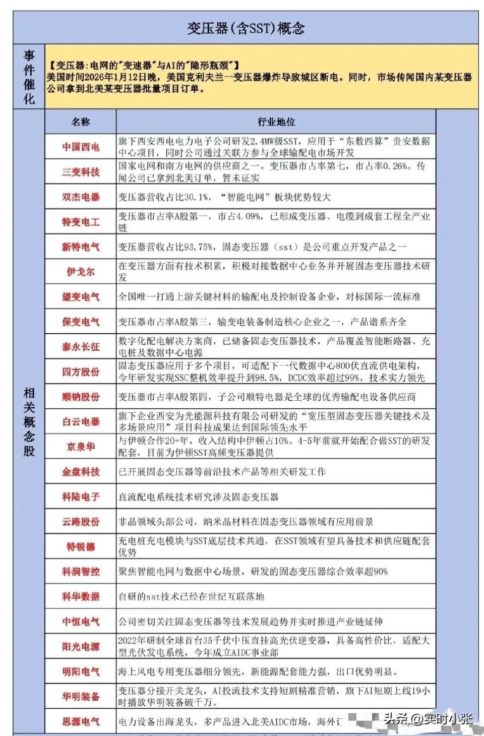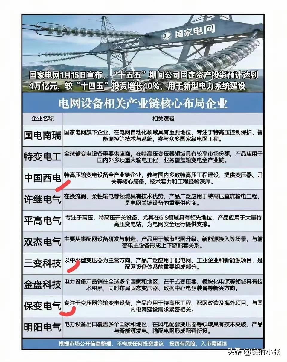 电网设备概念 一、国家电网官宣“十五五”4万亿投资计划,较“十四五”增长40%,新型电力系统建设按下加速键。下图产业链核心布局企业清单,梳理了国电南瑞、特变电工等龙头的技术优势与应用场景,清晰展现特高压、配网设备等关键赛道的产业图谱,为把握电网升级机遇提供参考。 二、美国克利夫兰变压器爆炸事件引发全球对电网设备安全的关注,叠加国内企业斩获北美订单的催化,变压器(含SST)概念站上风口。下图中清单梳理了中国西电、特变电工等产业链核心标的,覆盖传统变压器龙头与固态变压器(SST)技术先锋,清晰展现行业格局与技术演进方向,为把握电网升级与出海机遇提供重要参考。