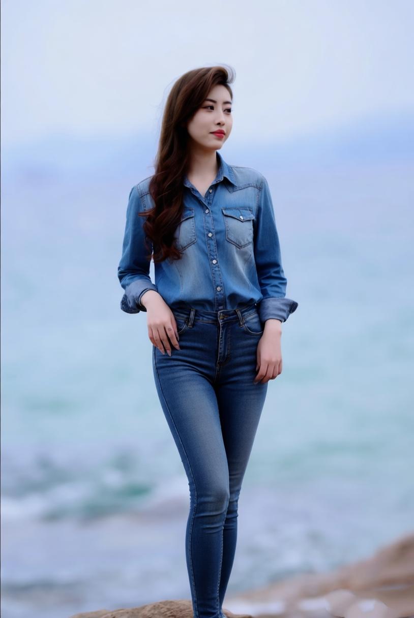 海边美女,白衬衫与牛仔裤的清新搭配,自然海风轻拂发梢,温柔迷人。