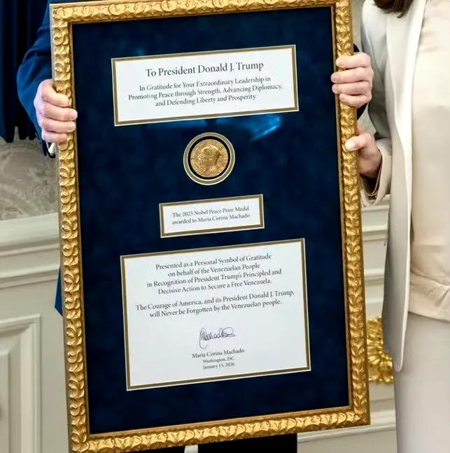 马查多向老特转让自己的诺贝尔和平奖,老特咧着大嘴笑了。这俩货,让诺贝尔和平奖的严肃性荡然无存。 民主党和挪威诺贝尔委员会估计现在心里郁闷死了,当初真是脑抽把诺贝尔和平奖发给了马查多。