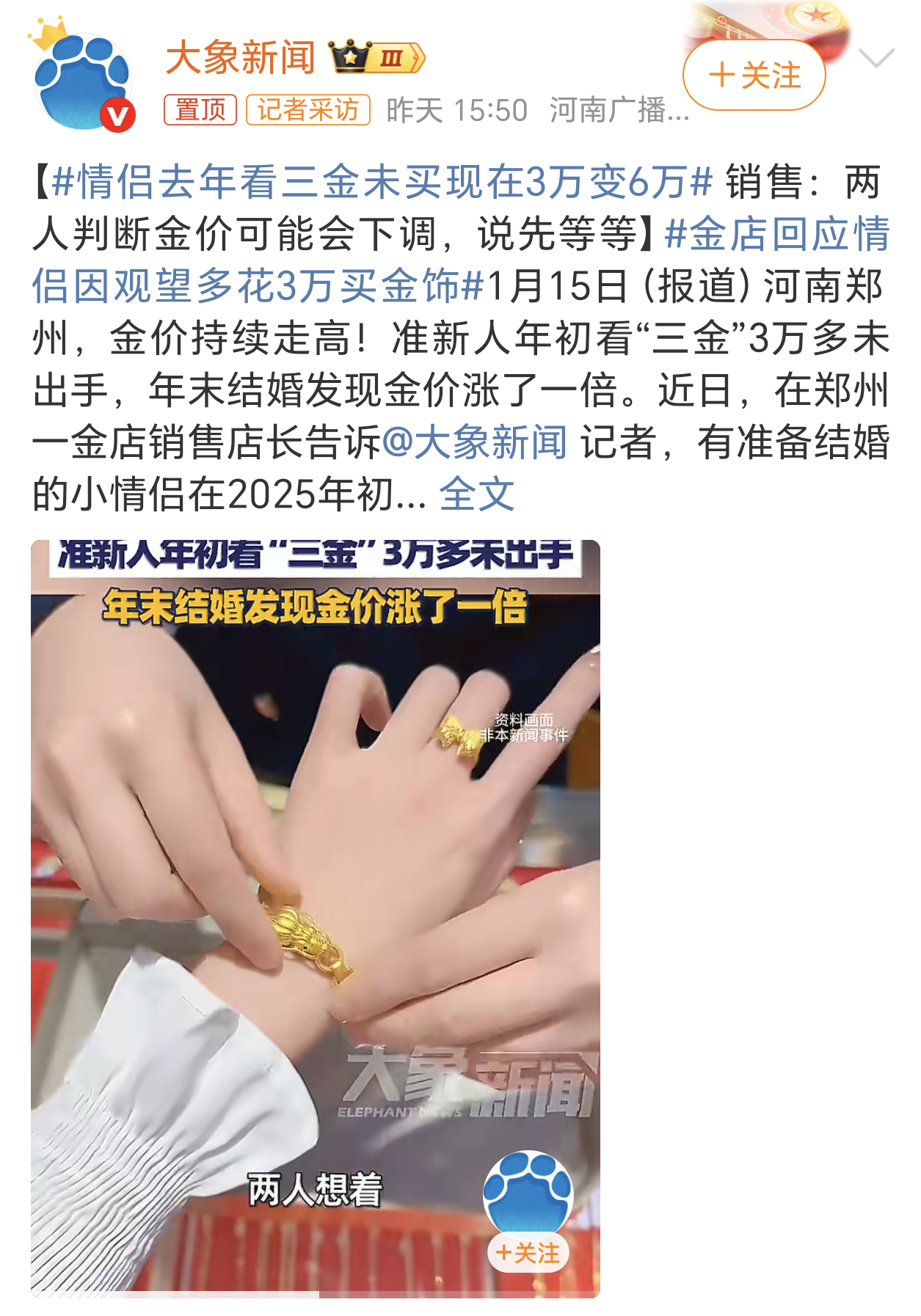 情侣去年看三金未买现在3万变6万我就说吧,这波金价上涨,对我们普通人来说其实影响不大,而且手里的黄金反而还跟着升值了。受影响最大的就是那些马上要结婚的情侣,刚需的“三金”用户,这结婚成本一下子提高太多了,不买吧还不太行,苦了他们了。