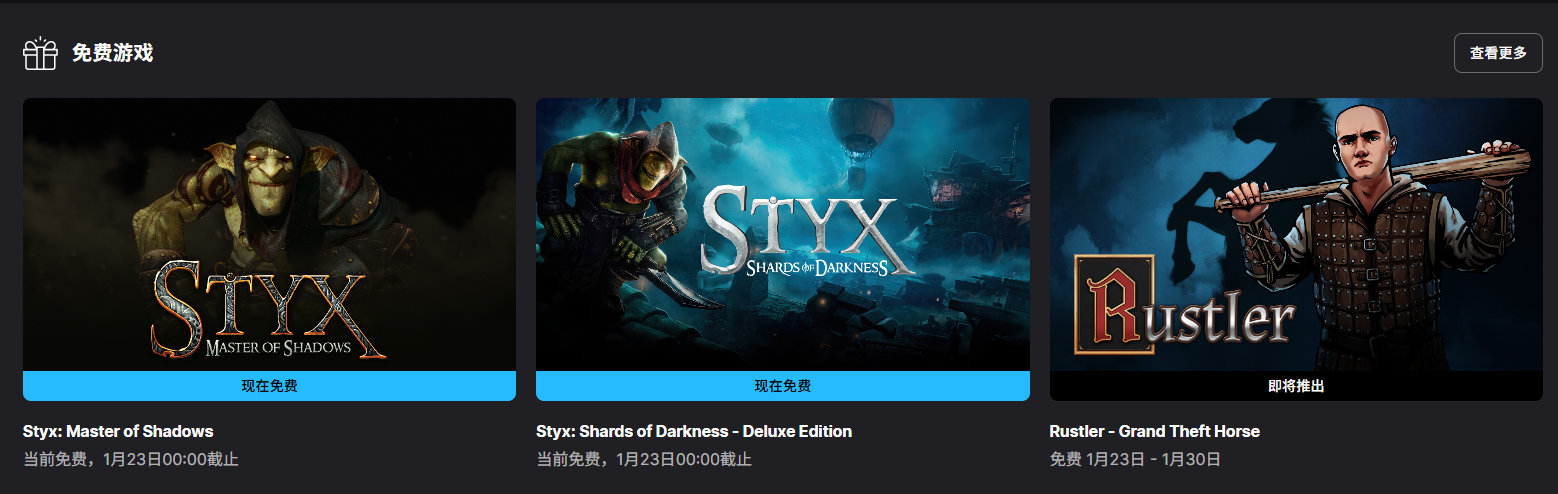 【隔壁喜加二】《冥河:暗影大师》《冥河:暗影碎片 豪华版》在Epic游戏商城开启免费领取,1月23日0点截止,总价124元,暂无官方中文。下周免费游戏为《侠盗猎马手》。