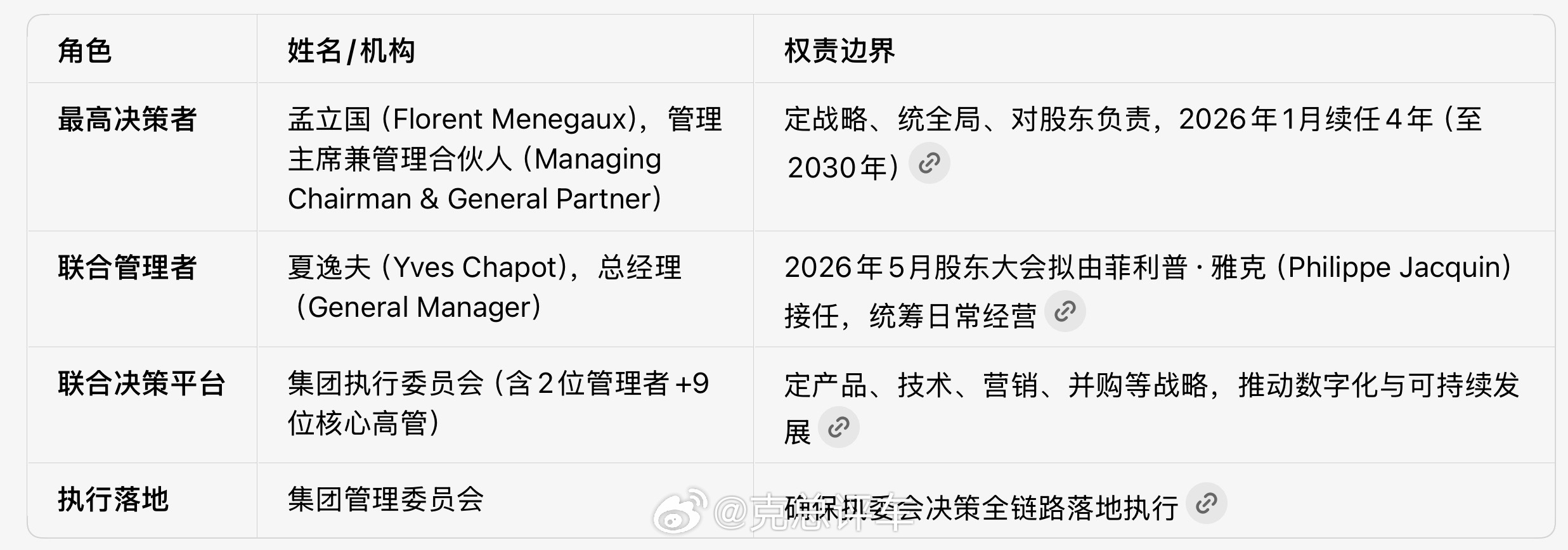 米其林采用管理+监督二元架构,核心由管理合伙人(CEO)孟立国Florent Menegaux总负责,设联合管理、执行委员会、集团管理委员会三层管理,叠加监事会与SAGES监督制衡,决策与执行清晰分工。以下为核心框架与关系:监督与治理主体• 监事会(Chair:Barbara Dalibard):监督管理层、审批高管任免/薪酬、把控战略与投资,与管理职能严格分离。• SAGES(辅助管理公司,Chair:Vincent Montagne):非管理普通合伙人,主导管理层继任与薪酬,与监事会协同保障治理合规。米其林企业管理米其林