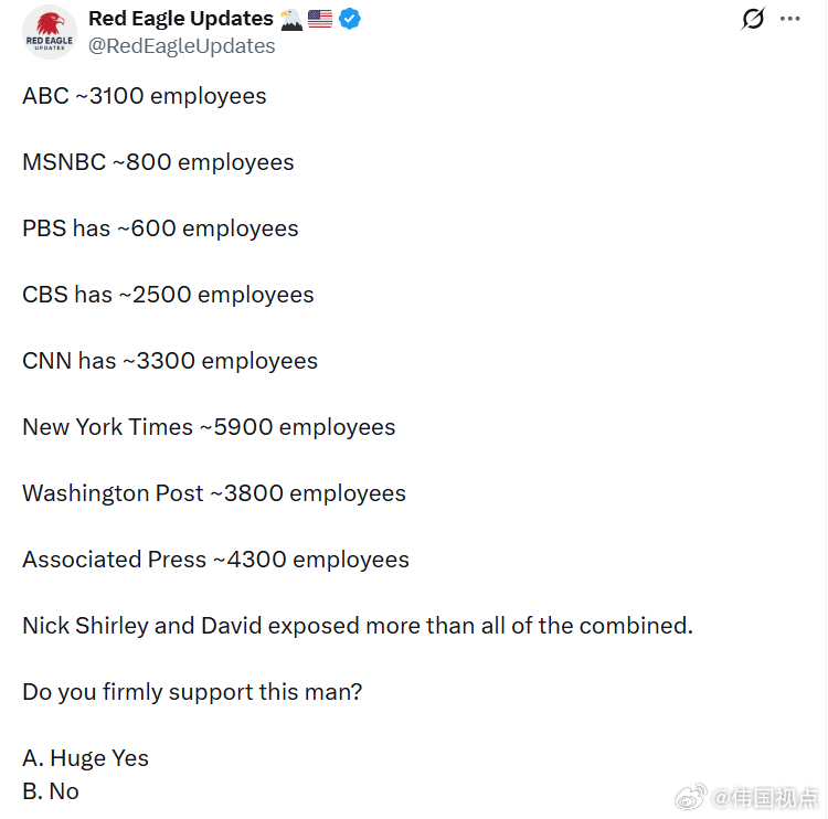 ABC约 3100 名员工MSNBC约 800 名员工PBS约 600 名员工CBS约 2500 名员工CNN约 3300 名员工纽约时报约 5900 名员工华盛顿邮报约 3800 名员工美联社约 4300 名员工尼克·施利和大卫揭露的内容比上述所有加起来还多。