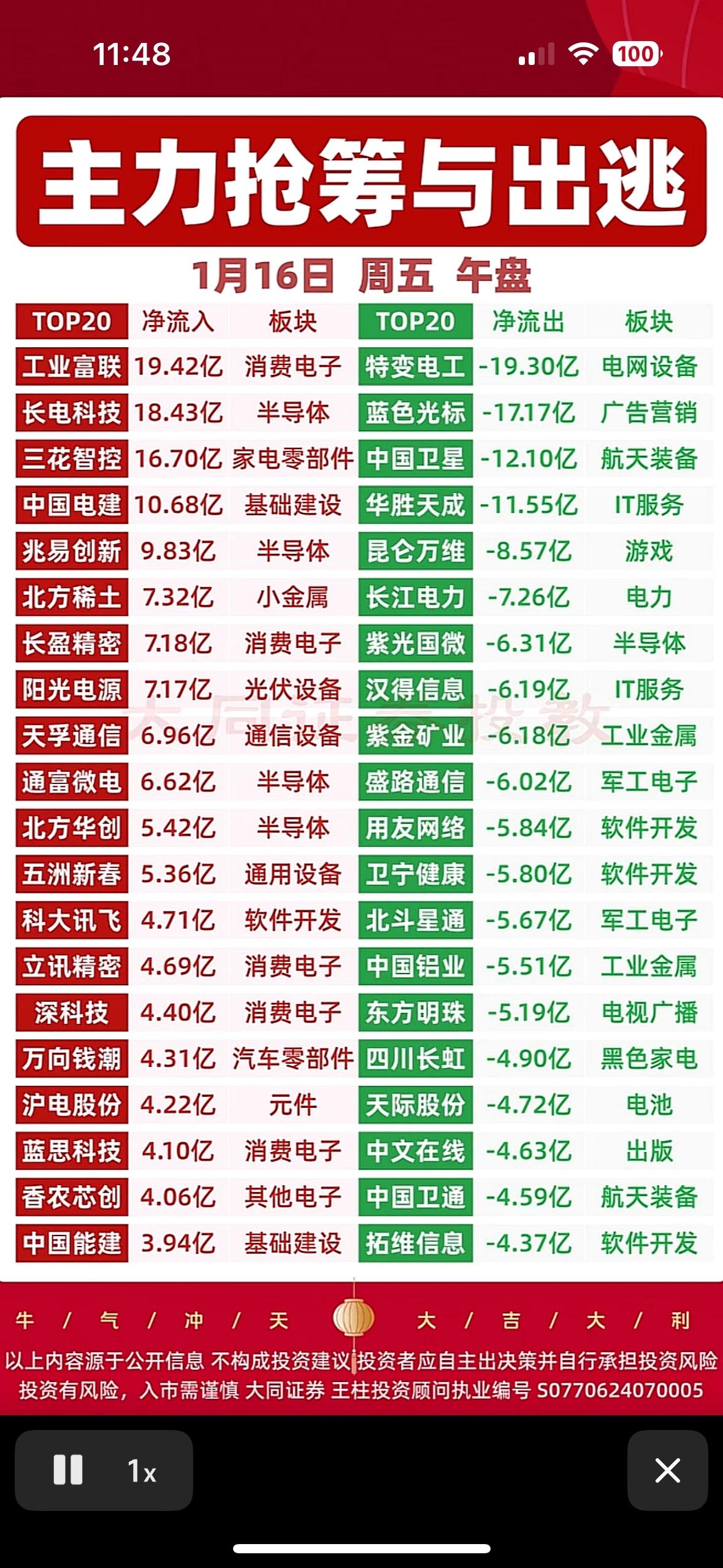 主力抢筹与出逃揭秘1月16日午盘TOP20净流入流出板块!📈📉
