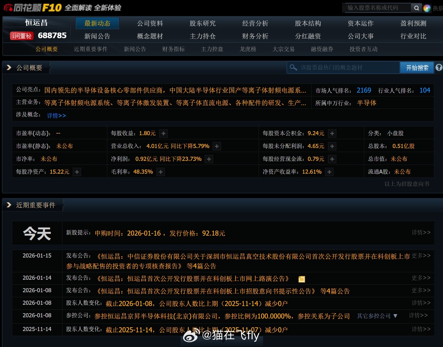 【1月16日新股申购】1只申购恒运昌 上科创板的票,主营等离子体射频电源系统、等离子体激发装置、等离子体直流电源、各种配件的研发、生产、销售及技术服务,并引进真空获得和流体控制等相关的核心零部件,围绕等离子体工艺提供核心零部件整体解决方案。 它是国内领先的半导体设备核心零部件供应商,中国大陆半导体行业国产等离子体射频电源系统厂商中市占率第一。猫说新股
