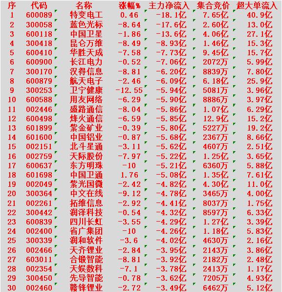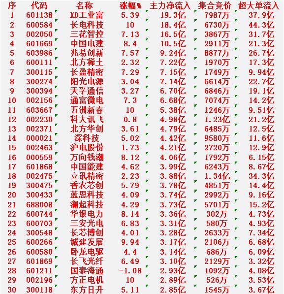 1月16日上午盘,主力趁低位,大幅买入的30名单: XD工业富联:涨幅 +5.39%,净流入 19.3亿元 长电科技:涨幅 +10.00%(涨停),净流入 18.4亿元 三花智控:涨幅 +7.13%,净流入 16.5亿元 中国电建:涨幅 +8.40%,净流入 10.5亿元 兆易创新:涨幅 +7.57%,净流入 9.24亿元 北方稀土:涨幅 +2.32%,净流入 7.22亿元 1月16日中午收盘,主力资金“大幅卖出”的30名单: 特变电工:涨幅 +0.46%,净流入 -18.1亿元 蓝色光标:跌幅 -8.64%,净流入 -17.6亿元 中国卫星:跌幅 -1.86%,净流入 -13.6亿元 昆仑万维:跌幅 -8.49%,净流入 -8.93亿元 华胜天成:跌幅 -7.58%,净流入 -7.73亿元