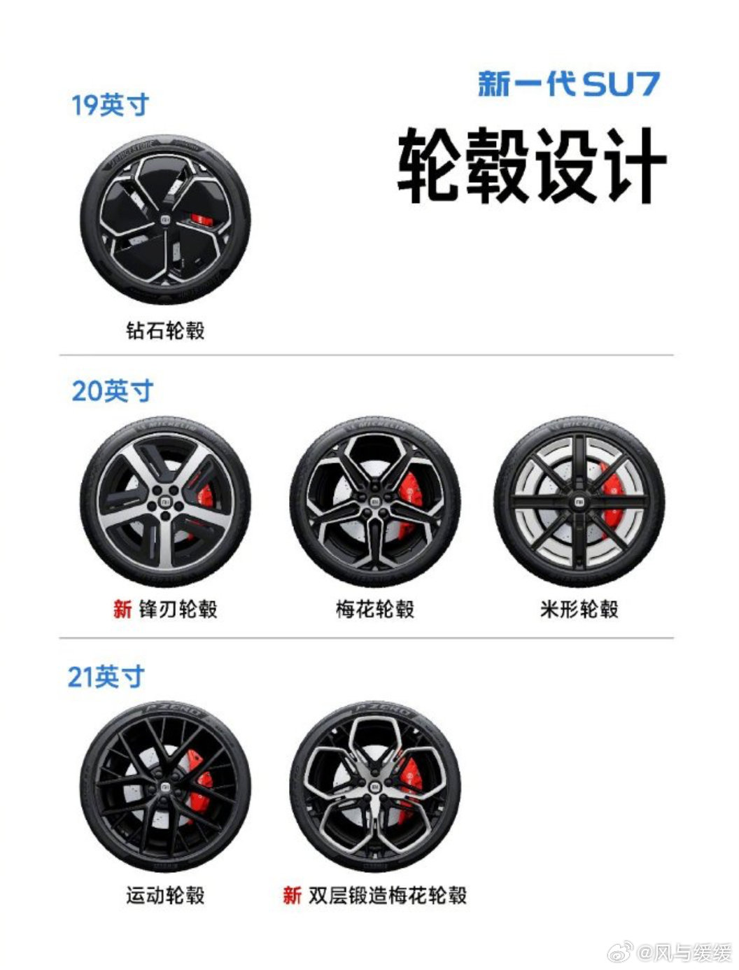 新一代 su7 全系标配后宽胎,6 款轮毂可以选择就问这款双层锻造梅花轮毂,戳中