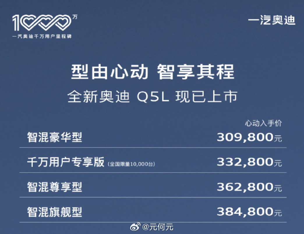 一汽奥迪Q5L 正式上市,售价 30.98-38.48万全系搭载华为乾崑智驾系统,北方奥迪在辅助驾驶方面全面拥抱HUA系,以及接下来大家可以看到的A6L(以及e-tron)、A5L、Q6L e-tron,都是HUA系的辅助驾驶。一汽奥迪携千万用户共赴乾崑 一汽奥迪