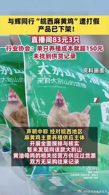 董宇辉并非助农,而是伤农;不是特产推广,而是涉嫌标签诈骗。有消费者晒出实物——无青喙、青胫、青爪特征,分明是普通淘汰蛋鸡,成本不足20元。而协会会长李书军的质问掷地有声:“若物流包装费10元、佣金10%、厂家利润10%,三只鸡净成本仅50元,这能是麻黄鸡?” “与辉同行”的品控漏洞,早已不是新鲜事。2025年3月,其热销的“大岸浪花虾仁”被央视3·15曝光磷酸盐超标145%,团队火速启动“退一赔三”,赔付金额约2000万元;同年1月,“臻牧纯羊奶粉”检出黄牛源性成分、“红参阿胶茶”未验出驴源性成分,涉虚假宣传;更早的2024年,董宇辉将养殖白虾称作“野生深海虾”,被质疑后以“员工口误”搪塞…… 每次翻车的剧本高度一致:曝光-下架-退赔-冷处理。只有央视315曝光,启动了退一赔三。其他都蒙混过关。董宇辉曾高调宣称“月耗百万检测费”,但三重审核机制却拦不住一只鸡的品种造假?究其原因,可以不用退赔的机制成了风险缓冲垫。但法律岂是儿戏?若麻黄鸡虚假宣传坐实,则涉嫌违反《反不正当竞争法》,最高可处百万罚款甚至吊销执照。若消费者集体诉讼,退一赔三远不足以覆盖欺诈代价。可惜现实是,平台与主播总能以“不知情”“供应商担责”金蝉脱壳。多方回应董宇辉带货麻黄鸡遭打假