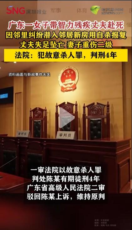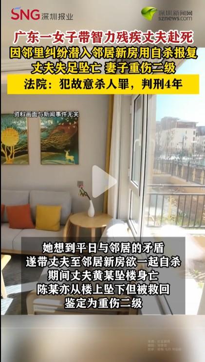这就是典型的害人终害己!广东这个女子本来还不错,丈夫出车祸智力残疾后她能够尽心长期照顾;但当误以为自己患癌后就想带丈夫一起自杀,因为和邻居有矛盾就想在邻居新房自杀,就有些故意害人给别人找晦气了。最终丈夫死亡她重伤二级还被判刑4年,完全是活该。但重伤二级比较重,不知道能不能生活自理,如果不能自理到监狱服刑还有人照顾,可能对她也是好事。毕竟如果受伤严重本来就活动不便,在监狱和在外面没什么区别,还不给家人添麻烦。不知道会不会真正收监?