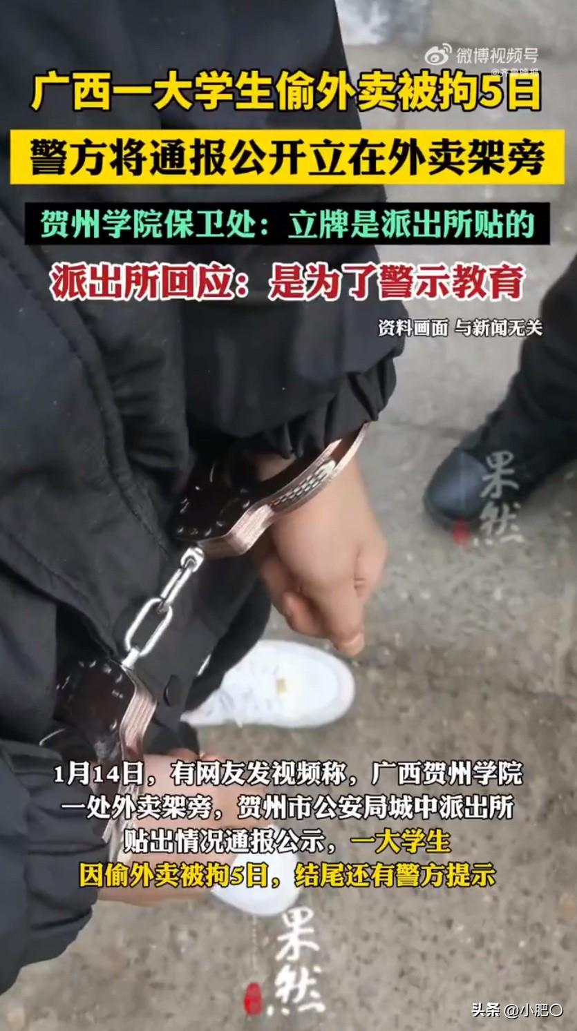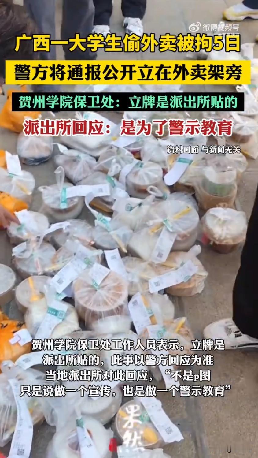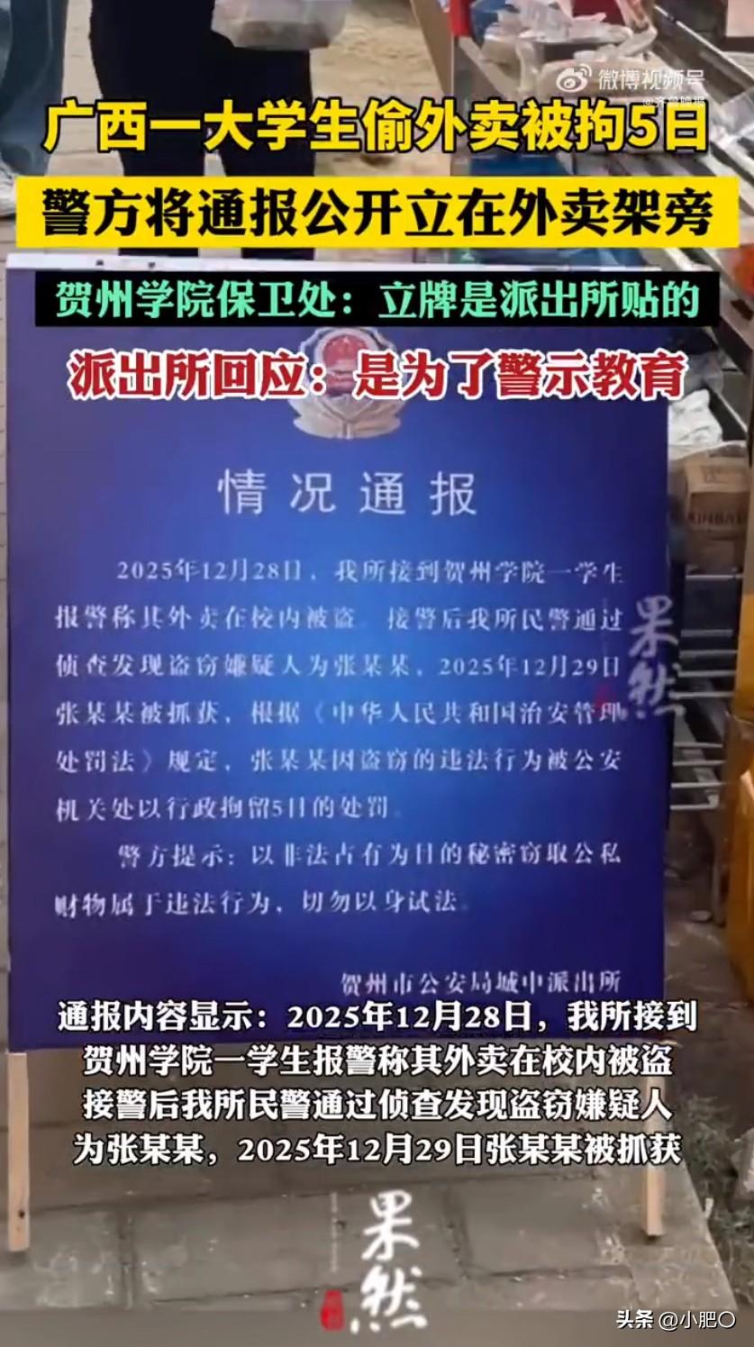 最近广西贺州一所高校的外卖架旁,立了块警方通报牌,直接把全网都炸出了讨论欲,大学生偷外卖被拘通报公示外卖架边 的话题一出来,网友们瞬间分成两派吵翻了天。事情其实不复杂,就是学校里有个姓张的同学,趁别人不注意偷拿了其他同学的外卖,被失主报警后,警方很快就通过监控锁定了他,没几天就把人抓获了。别看只是一份外卖,这行为已经构成了盗窃违法,警方依据《治安管理处罚法》,直接给了行政拘留5天的处罚,这波操作直接打破了很多人“偷外卖不算大事”的认知。 这牌子往那儿一立,路过的学生、送外卖的小哥都能看见。通报里把张某偷外卖的事儿说得明明白白,还提醒大家别干这种违法的事儿。学校保卫处的人说,这牌子是派出所贴的,他们也管不了。派出所那边倒是挺直接,说这么做就是为了警示教育,让大家看看偷外卖的后果,别再犯同样的错。 这事儿一曝光,网上就炸开了锅。有人觉得这办法挺有效,公开通报能让想偷外卖的人掂量掂量,毕竟谁也不想自己的糗事被这么多人知道。现在大学里偷外卖的情况也不少见,有的同学点了外卖,下去取的时候就发现没了,挺影响心情的。这么一公示,说不定能起到威慑作用。 但也有人觉得这么做不太合适,毕竟张某还是个大学生,把通报公开在学校这么显眼的地方,有点太不给人留面子了,万一他以后在学校里不好过怎么办。而且偷外卖虽然不对,但也不是什么大罪,这么公开处理,会不会有点小题大做了。 其实仔细想想,这事儿背后反映的问题也不少。现在大学生偷外卖的情况为啥屡禁不止?一方面可能是有些人确实法律意识淡薄,觉得偷个外卖不算啥大事;另一方面,也可能是学校里的外卖管理有点乱,外卖架没人看管,给了一些人可乘之机。 派出所这么做,初衷是好的,就是想通过警示教育,让大家知道偷东西是违法的,不管价值多少,都不能干。但在执行的时候,是不是也得考虑一下当事人的隐私和后续影响呢?毕竟公开通报这种方式,对当事人的心理压力还是挺大的。 事件发酵后,贺州学院也赶紧升级了外卖架的管理,加装了高清夜视监控,划分了专属取餐区域,还安排了学生会成员轮流值守。说到底,惩戒从来不是目的,让大家不敢偷、不想偷才是关键。希望这事儿能给所有学生提个醒,莫以恶小而为之,尊重别人的财物,也是守住自己的人生底线。 外卖盗窃 警方在校内公示大学生偷外卖被拘5日 大学生偷外卖被拘 警方通报 来源:果然视频
