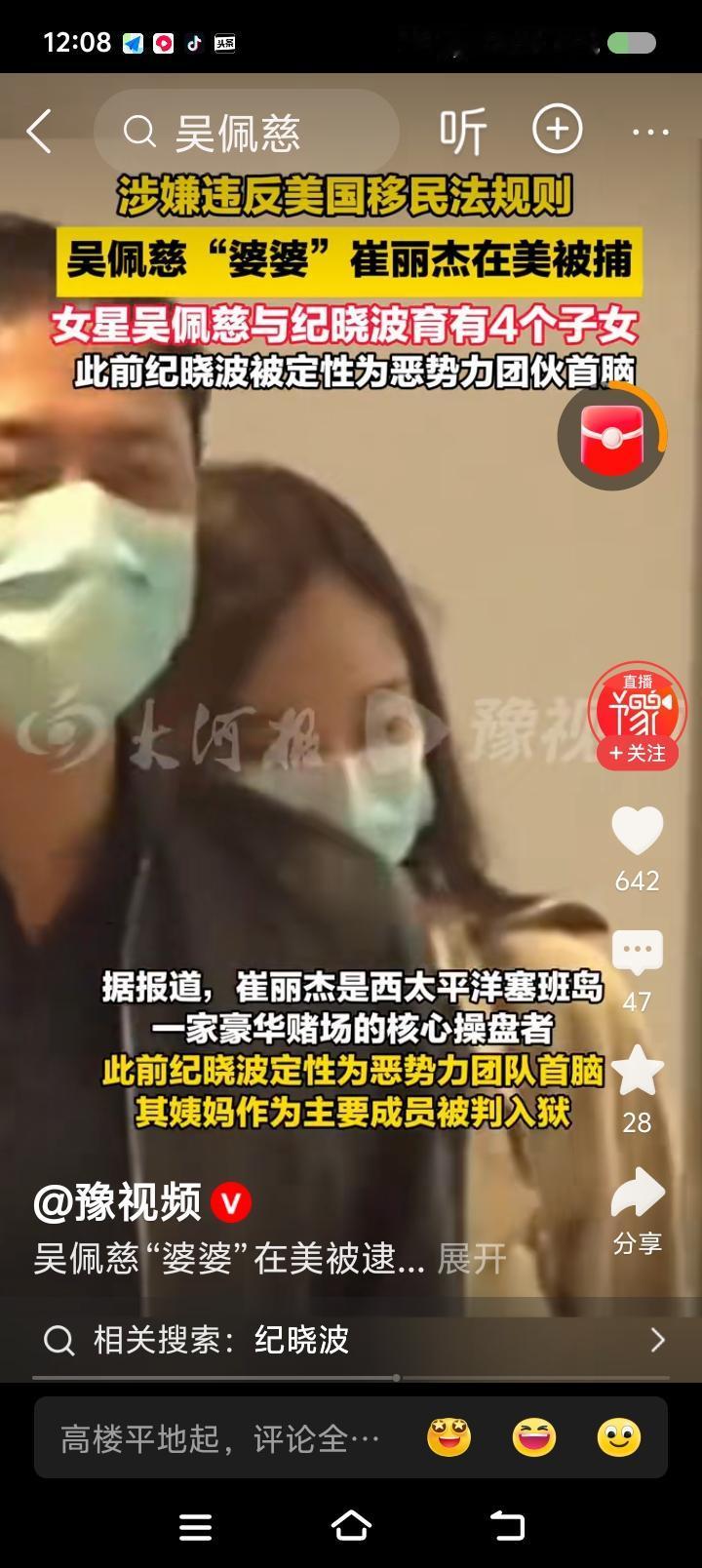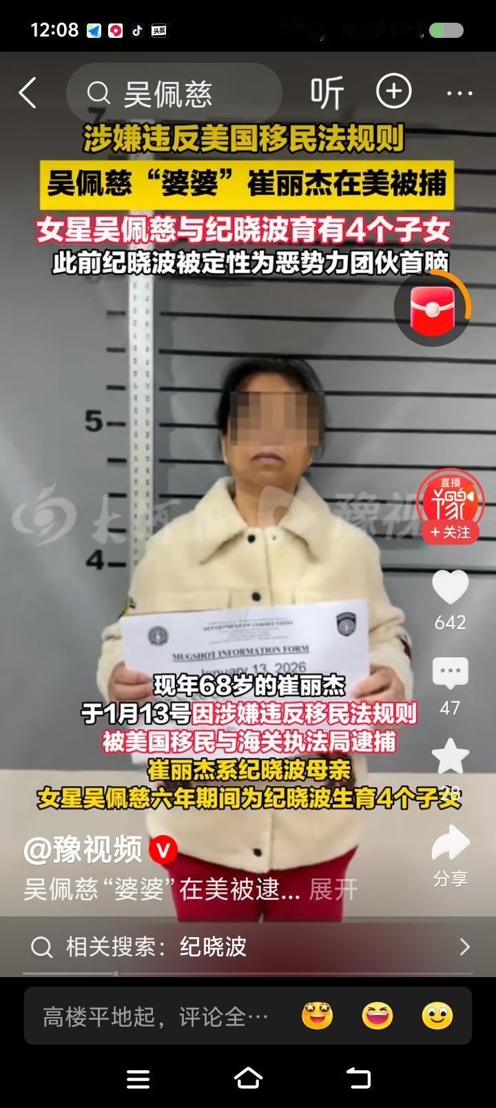 此报道有误!—— 据报道,艺人吴某慈的婆婆崔某涉嫌违反移民法,在美国被捕。崔某可能是某赌场核心操盘者。 点评: 资料显示,吴某慈未婚。与男友有生育。 既然没有婚姻关系,此案对吴某慈应该没有影响。但网友想象力丰富。 选择好伴侣,比经营事业还难。