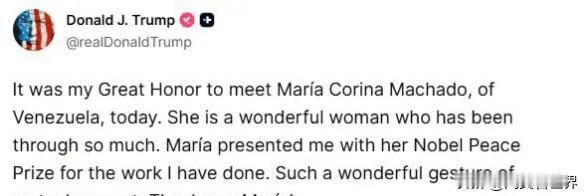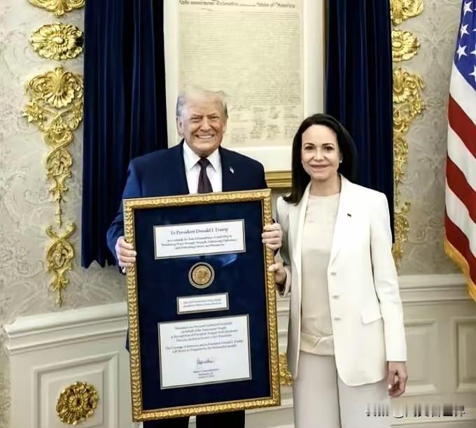 马查多向特朗普“颁发”诺贝尔和平奖奖章,特朗普欣然接受 当地时间15日,特朗普在白宫会见了委内瑞拉反对派领导人、2025年诺贝尔和平奖获得者马查多。会见开始时,马查多将她的诺贝尔和平奖奖章“赠予”了特朗普,而特朗普则欣然接受。 “赠予”显然没有“颁发”正规,所以,特朗普在社交媒体上发帖称:“她为我所做的工作,向我‘颁发’了这枚诺贝尔和平奖章。” 随后,两人开始互相“吹捧”。特朗普称:“能与玛丽亚·科里娜·马查多会面,对我而言是莫大的荣幸。她是一位坚毅的女性,历经了诸多磨难。” 而马查多则“回捧”道:特朗普是美国首任总统华盛顿的继承者。 毋庸讳言,这是一次“各取所需”的互动。因为,能够得到特朗普的支持,马查多距离执政委内瑞拉可以说是又近了一步。而特朗普也得到了他心心念念的这枚诺贝尔和平奖奖章。 据不完全统计,在过去的一年时间里,特朗普将诺贝尔和平奖念叨了九九八十一次。