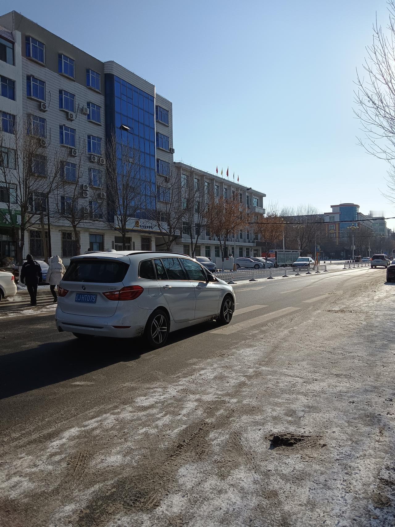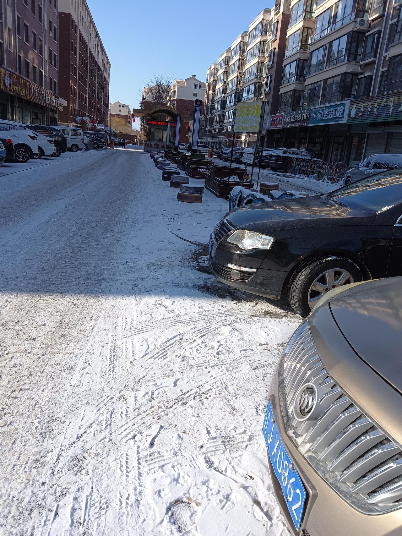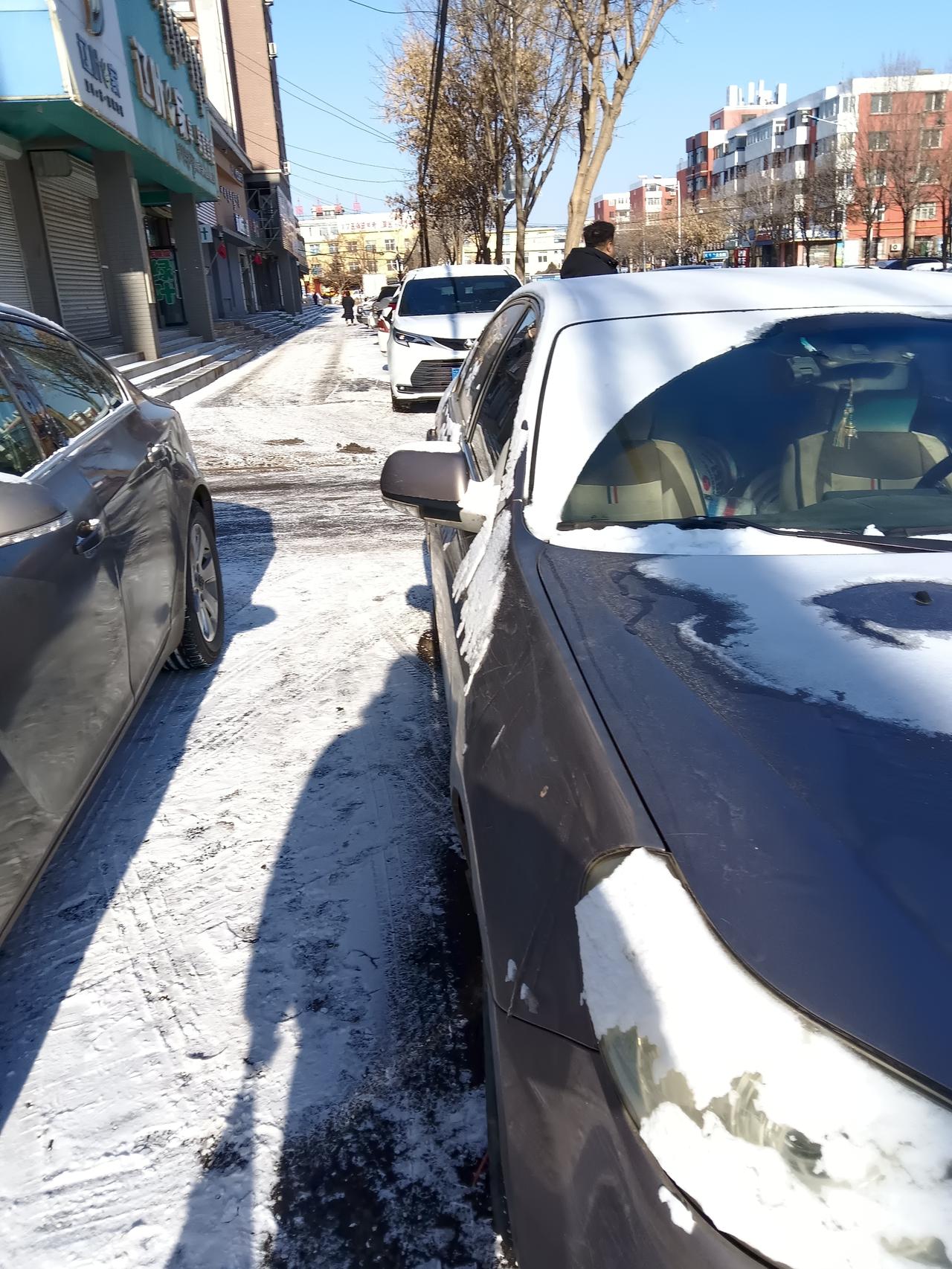 冬日雪景中的城市街景,车辆停靠在路边,阳光洒在积雪上,显得格外宁静。城市冬日雪景 冬日路边景色 冬日街景