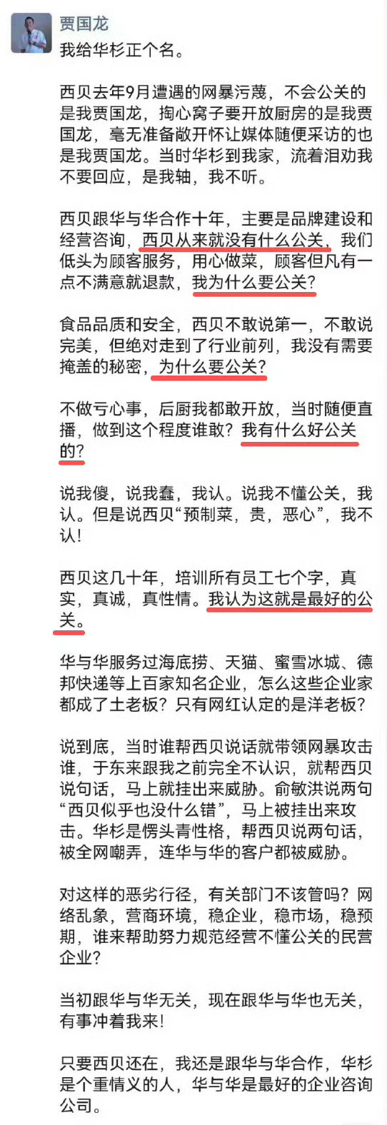 贾国龙回应西贝公关副总裁离职西贝这个事还没结束啊,看来贾国龙的确不懂公关,西贝也没有公关,或者说,西贝也没有人能管得住老板的嘴,从始至终,西贝这个事最好的公关应该就是让老板闭嘴🤐