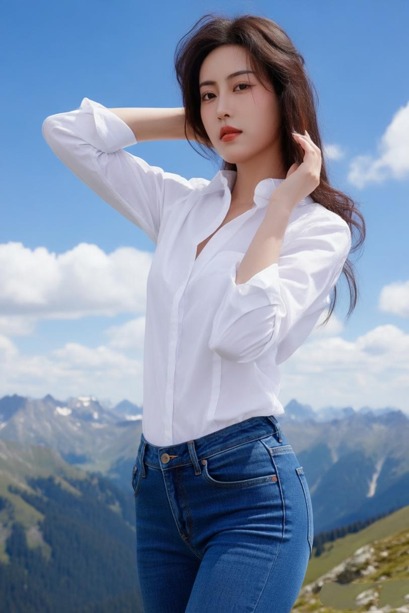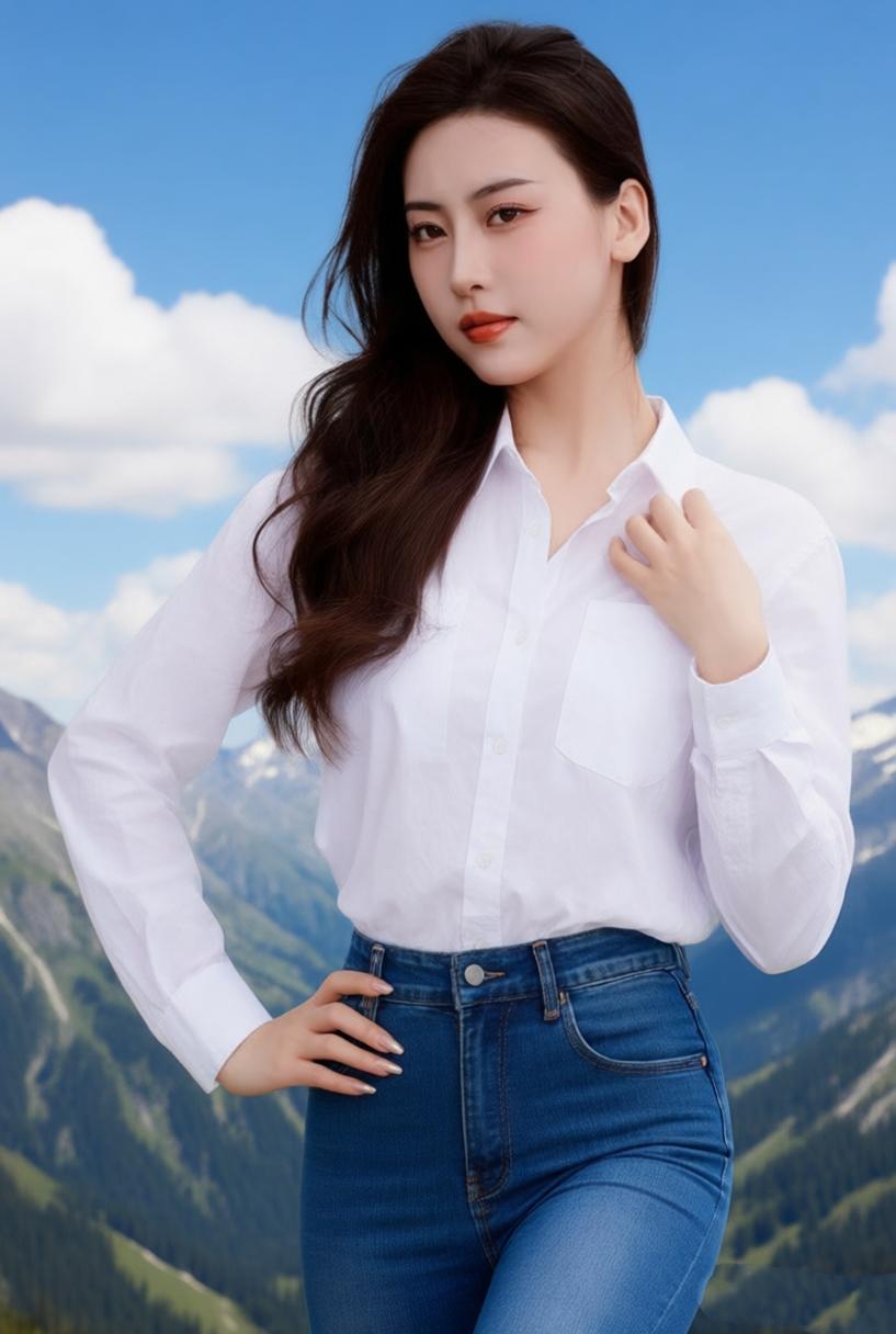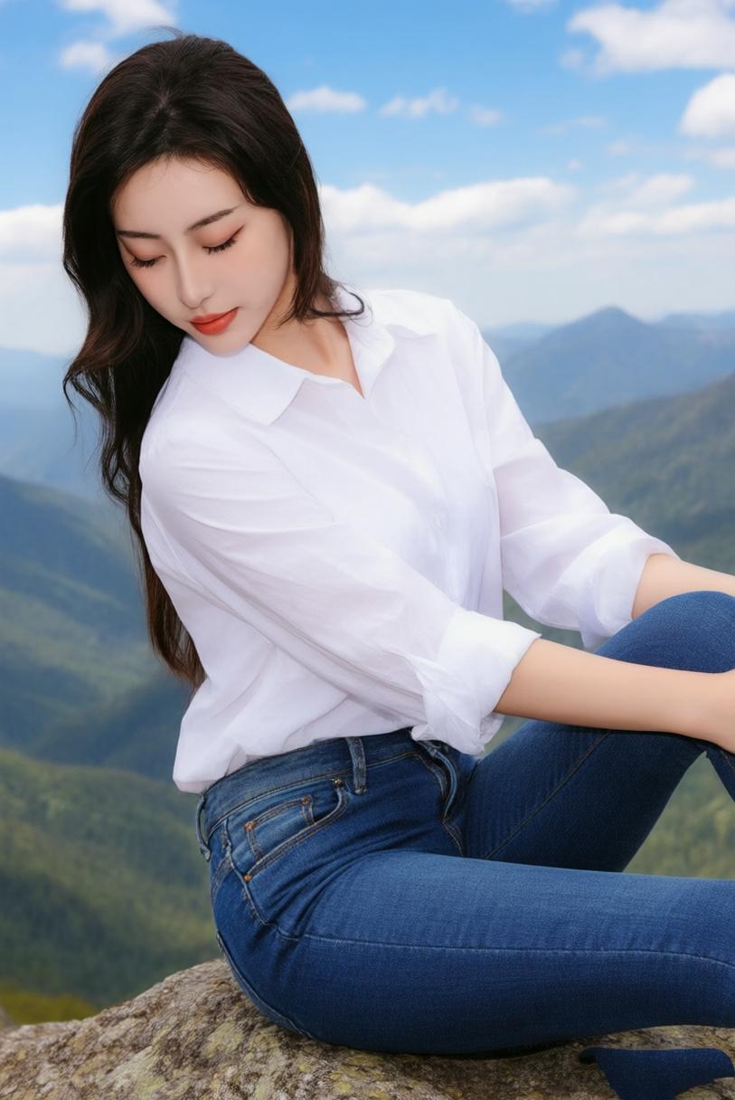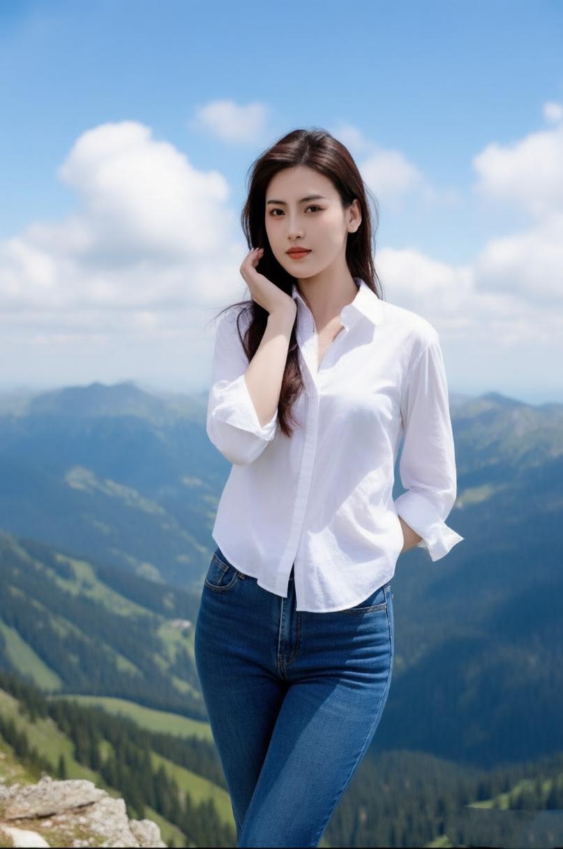 海边美女,白衬衫与牛仔裤的清新搭配,自然海风轻拂发梢,温柔迷人。