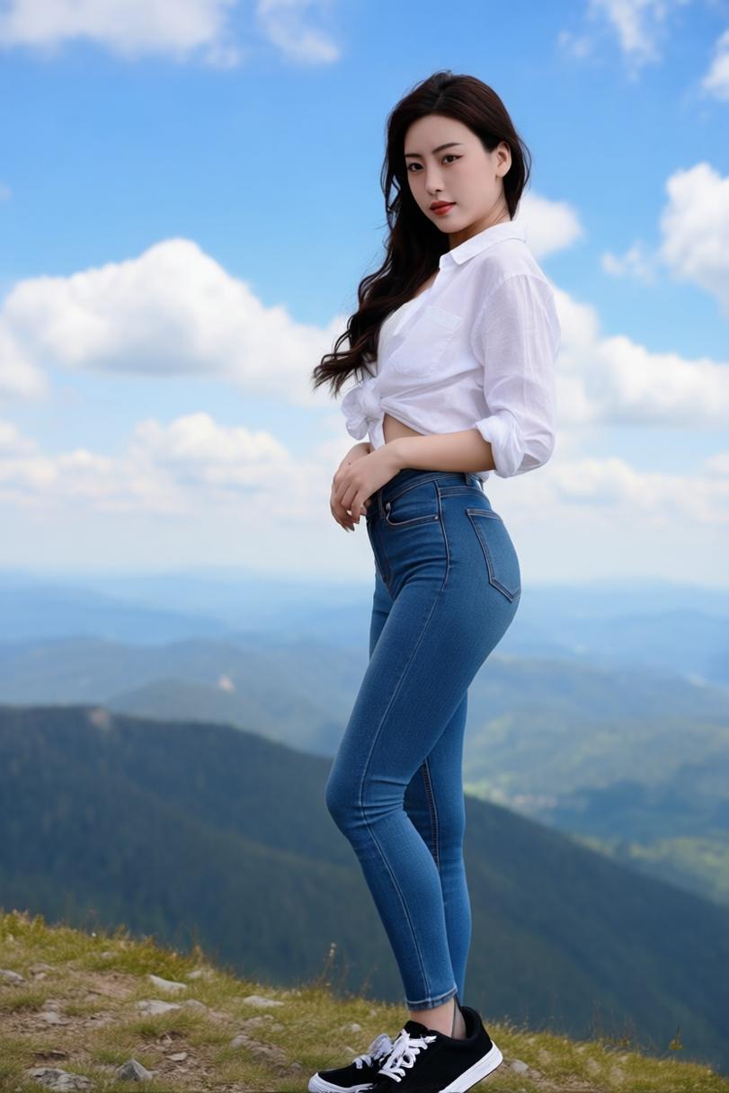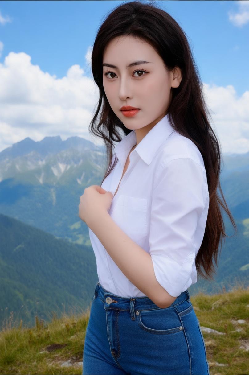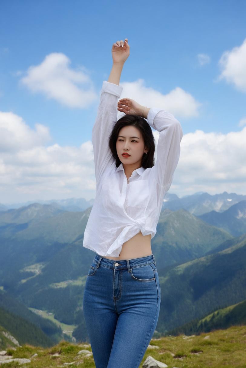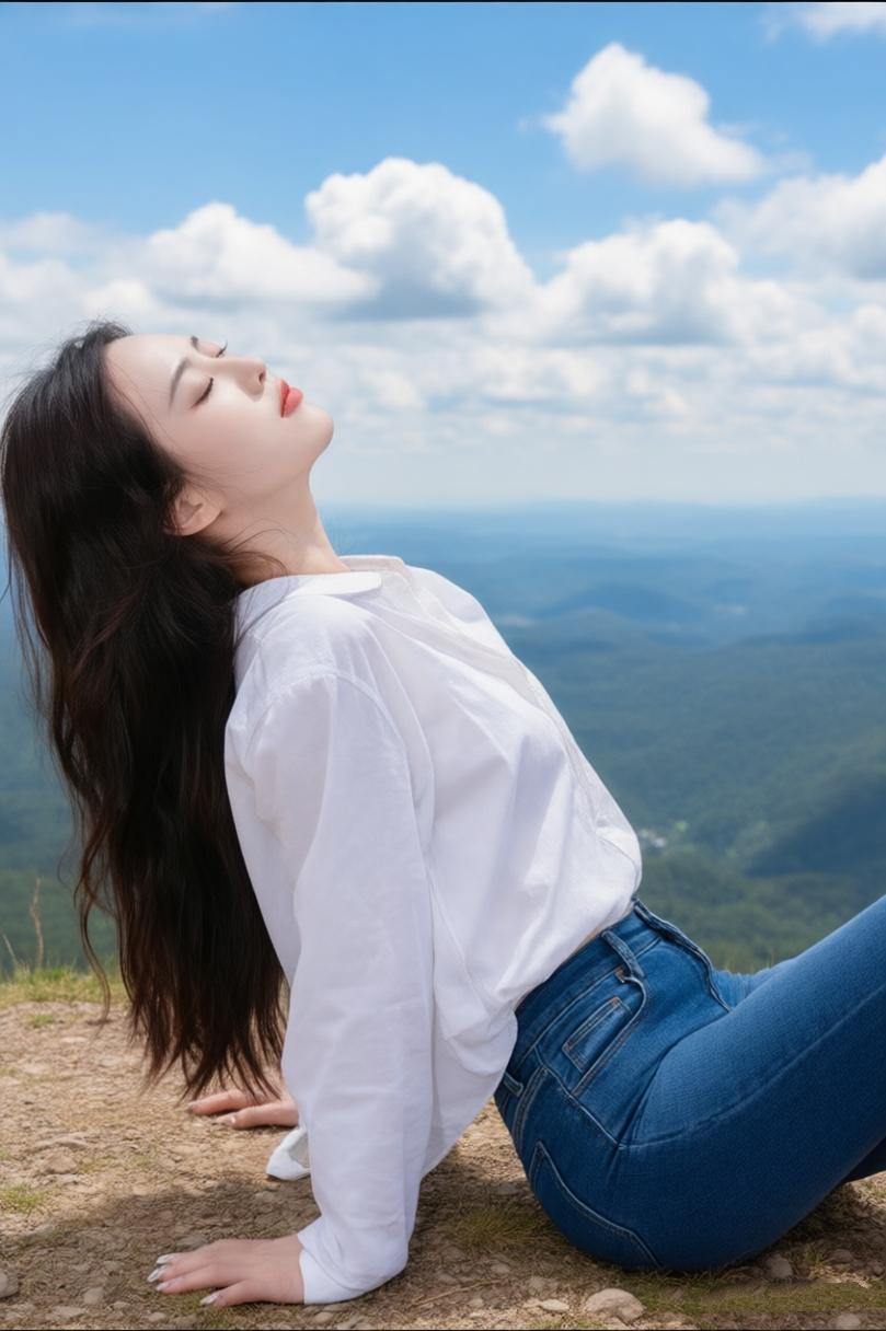 海边美女,白衬衫与牛仔裤的清新搭配,自然海风轻拂发梢,温柔迷人。