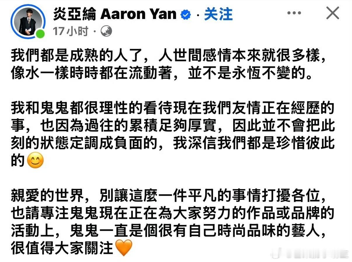 炎亚纶发文再谈与鬼鬼关系炎亚纶深信与鬼鬼都是珍惜彼此的炎亚纶发文再谈与鬼鬼关系