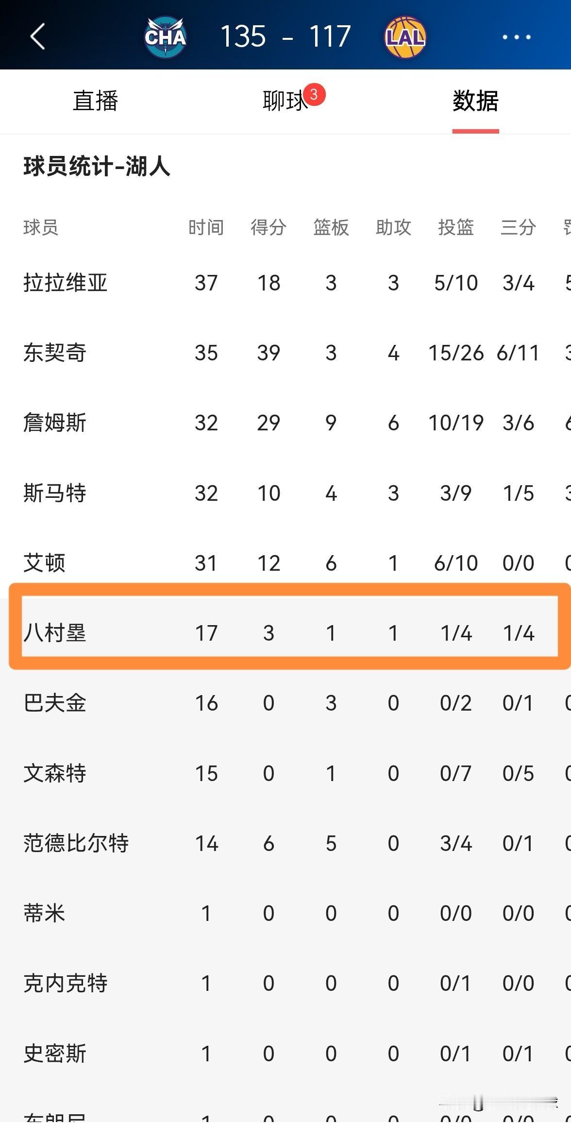 我强烈建议湖人立刻交易走八村塁!在今天湖人主场以117:135输给黄蜂的比赛中,八村塁在攻防两端的表现都非常低迷,他的场上正负值为全队最低的-17。 整场比赛下来,八村塁替补出战17分钟,三分球4中1仅仅得到3分,还有1次失误和2次犯规,他的场上正负值为-17。