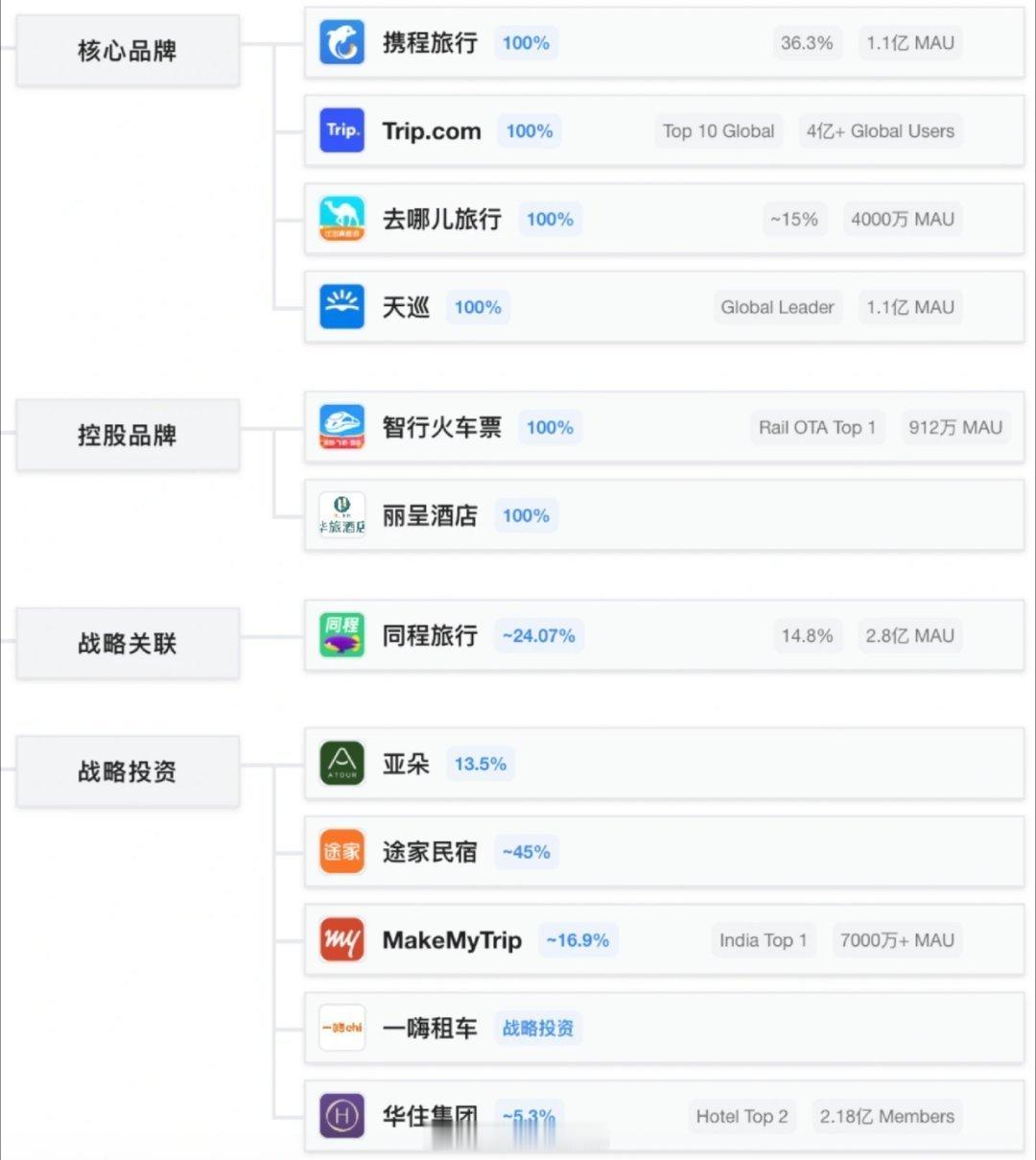 携程被多次约谈仍不改携程这性质就有点严重了,被约谈还不改,而且是多次。查了一下,去哪儿、Trip.com 其实都是携程系的,还控股了智行,同程旅行也有股份,双方还有合作,我之前还以为双方是死对头呢。再加上携程还投资了华住集团、亚朵,这下就更能理解为什么会被反垄断调查了。